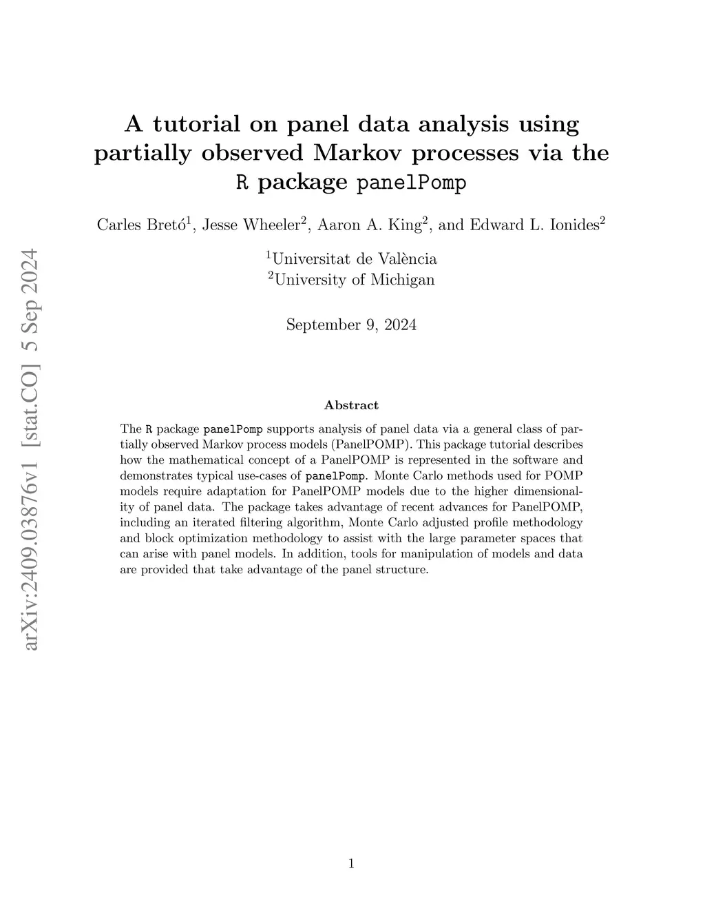 The R package panelPomp supports analysis of panel data via a general class of partially observed Markov process models (PanelPOMP). This package tutorial describes how the mathematical concept of a PanelPOMP is represented in the software and demonstrates typical use-cases of panelPomp. Monte Carlo methods used for POMP models require adaptation for PanelPOMP models due to the higher dimensionality of panel data. The package takes advantage of recent advances for PanelPOMP, including an iterated filtering algorithm, Monte Carlo adjusted profile methodology and block optimization methodology to assist with the large parameter spaces that can arise with panel models. In addition, tools for manipulation of models and data are provided that take advantage of the panel structure.