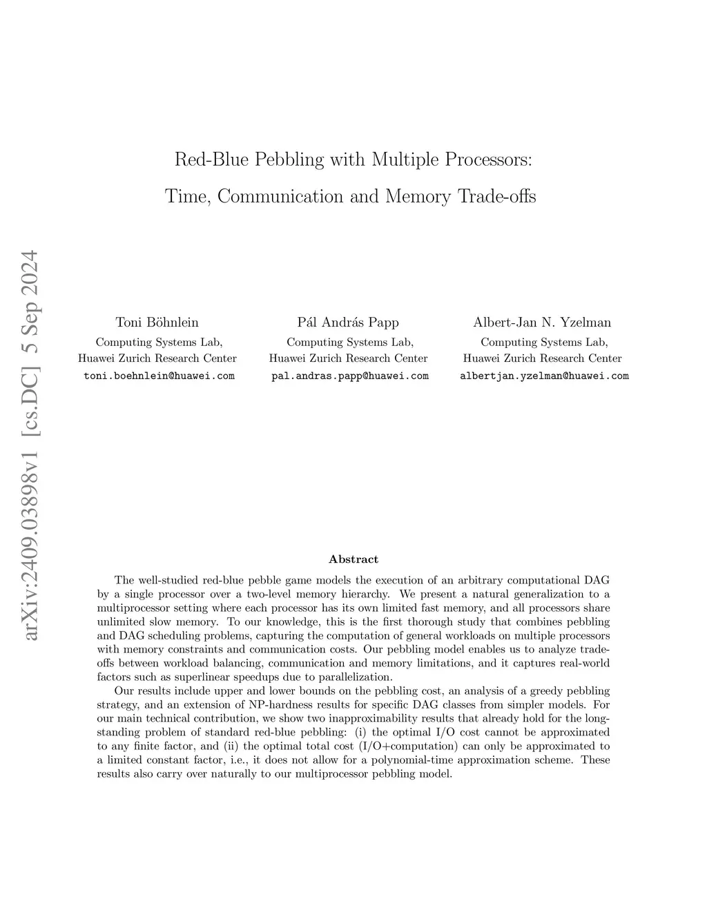 The well-studied red-blue pebble game models the execution of an arbitrary computational DAG by a single processor over a two-level memory hierarchy. We present a natural generalization to a multiprocessor setting where each processor has its own limited fast memory, and all processors share unlimited slow memory. To our knowledge, this is the first thorough study that combines pebbling and DAG scheduling problems, capturing the computation of general workloads on multiple processors with memory constraints and communication costs. Our pebbling model enables us to analyze trade-offs between workload balancing, communication and memory limitations, and it captures real-world factors such as superlinear speedups due to parallelization. Our results include upper and lower bounds on the pebbling cost, an analysis of a greedy pebbling strategy, and an extension of NP-hardness results for specific DAG classes from simpler models. For our main technical contribution, we show two inapproximability results that already hold for the long-standing problem of standard red-blue pebbling: (i) the optimal I/O cost cannot be approximated to any finite factor, and (ii) the optimal total cost (I/O+computation) can only be approximated to a limited constant factor, i.e., it does not allow for a polynomial-time approximation scheme. These results also carry over naturally to our multiprocessor pebbling model.