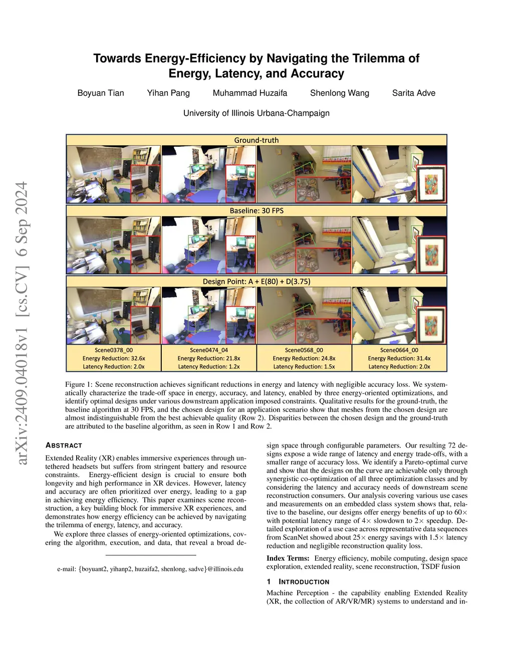 Extended Reality (XR) enables immersive experiences through untethered headsets but suffers from stringent battery and resource constraints. Energy-efficient design is crucial to ensure both longevity and high performance in XR devices. However, latency and accuracy are often prioritized over energy, leading to a gap in achieving energy efficiency. This paper examines scene reconstruction, a key building block for immersive XR experiences, and demonstrates how energy efficiency can be achieved by navigating the trilemma of energy, latency, and accuracy. We explore three classes of energy-oriented optimizations, covering the algorithm, execution, and data, that reveal a broad design space through configurable parameters. Our resulting 72 designs expose a wide range of latency and energy trade-offs, with a smaller range of accuracy loss. We identify a Pareto-optimal curve and show that the designs on the curve are achievable only through synergistic co-optimization of all three optimization classes and by considering the latency and accuracy needs of downstream scene reconstruction consumers. Our analysis covering various use cases and measurements on an embedded class system shows that, relative to the baseline, our designs offer energy benefits of up to 60X with potential latency range of 4X slowdown to 2X speedup. Detailed exploration of a use case across representative data sequences from ScanNet showed about 25X energy savings with 1.5X latency reduction and negligible reconstruction quality loss.