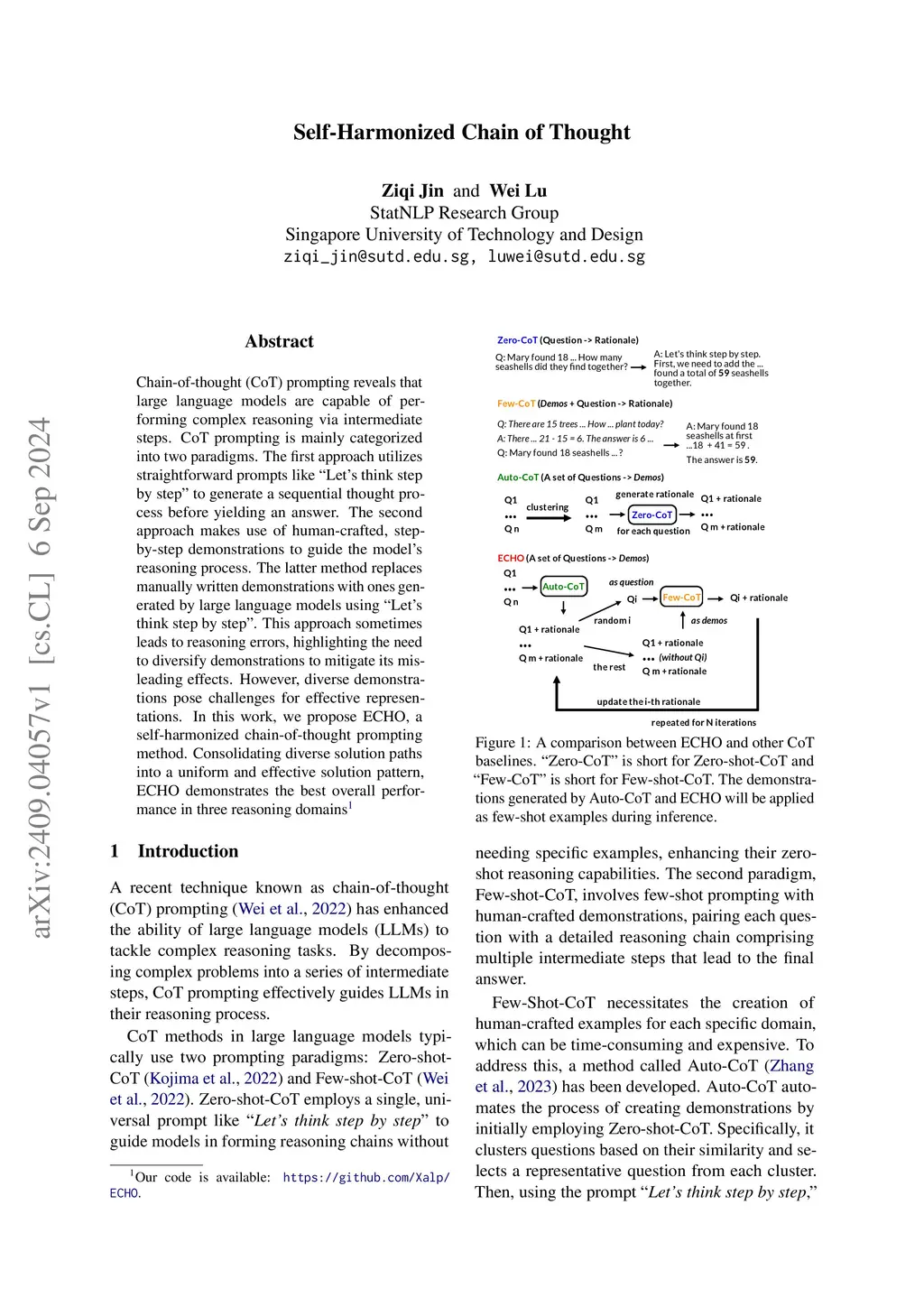 Chain-of-thought (CoT) prompting has demonstrated the capacity of large language models to perform complex reasoning through intermediate steps. While effective, current CoT methods face challenges: Zero-shot-CoT can lead to reasoning errors, and Few-shot-CoT requires labor-intensive manual demonstrations. Auto-CoT attempts to address these issues by automatically generating diverse demonstrations, but this diversity can lead to inconsistent reasoning patterns. We propose ECHO (Self-Harmonized Chain of Thought), a novel method that unifies diverse solution paths into a consistent and effective reasoning pattern. ECHO employs an iterative process to refine and harmonize automatically generated demonstrations, mitigating the limitations of existing approaches. Our comprehensive experiments across arithmetic, commonsense, and symbolic reasoning tasks demonstrate that ECHO outperforms Auto-CoT by an average of 2.8%. These findings suggest that ECHO represents a significant step towards more robust and generalizable automated reasoning in large language models.