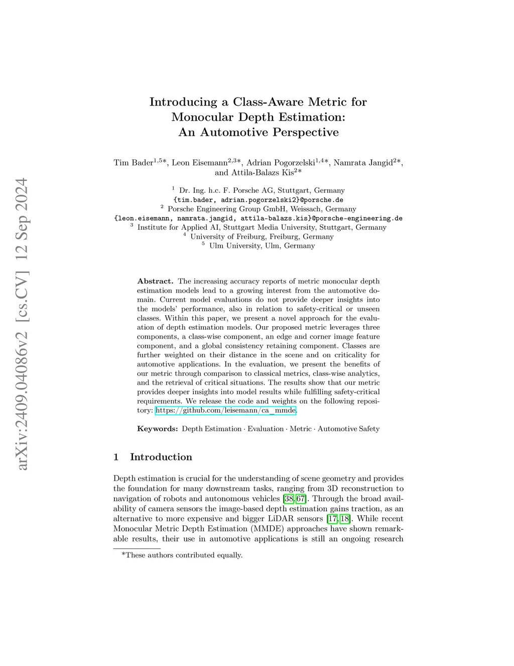 The increasing accuracy reports of metric monocular depth estimation models lead to a growing interest from the automotive domain. Current model evaluations do not provide deeper insights into the models' performance, also in relation to safety-critical or unseen classes. Within this paper, we present a novel approach for the evaluation of depth estimation models. Our proposed metric leverages three components, a class-wise component, an edge and corner image feature component, and a global consistency retaining component. Classes are further weighted on their distance in the scene and on criticality for automotive applications. In the evaluation, we present the benefits of our metric through comparison to classical metrics, class-wise analytics, and the retrieval of critical situations. The results show that our metric provides deeper insights into model results while fulfilling safety-critical requirements. We release the code and weights on the following repository: https://github.com/leisemann/ca_mmde