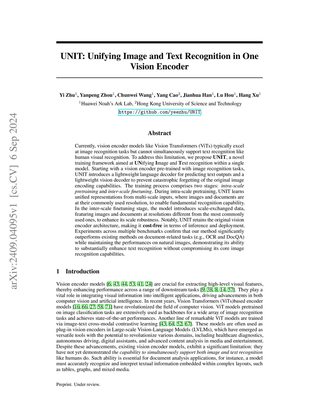 UNIT: Unifying Image and Text Recognition in One Vision Encoder