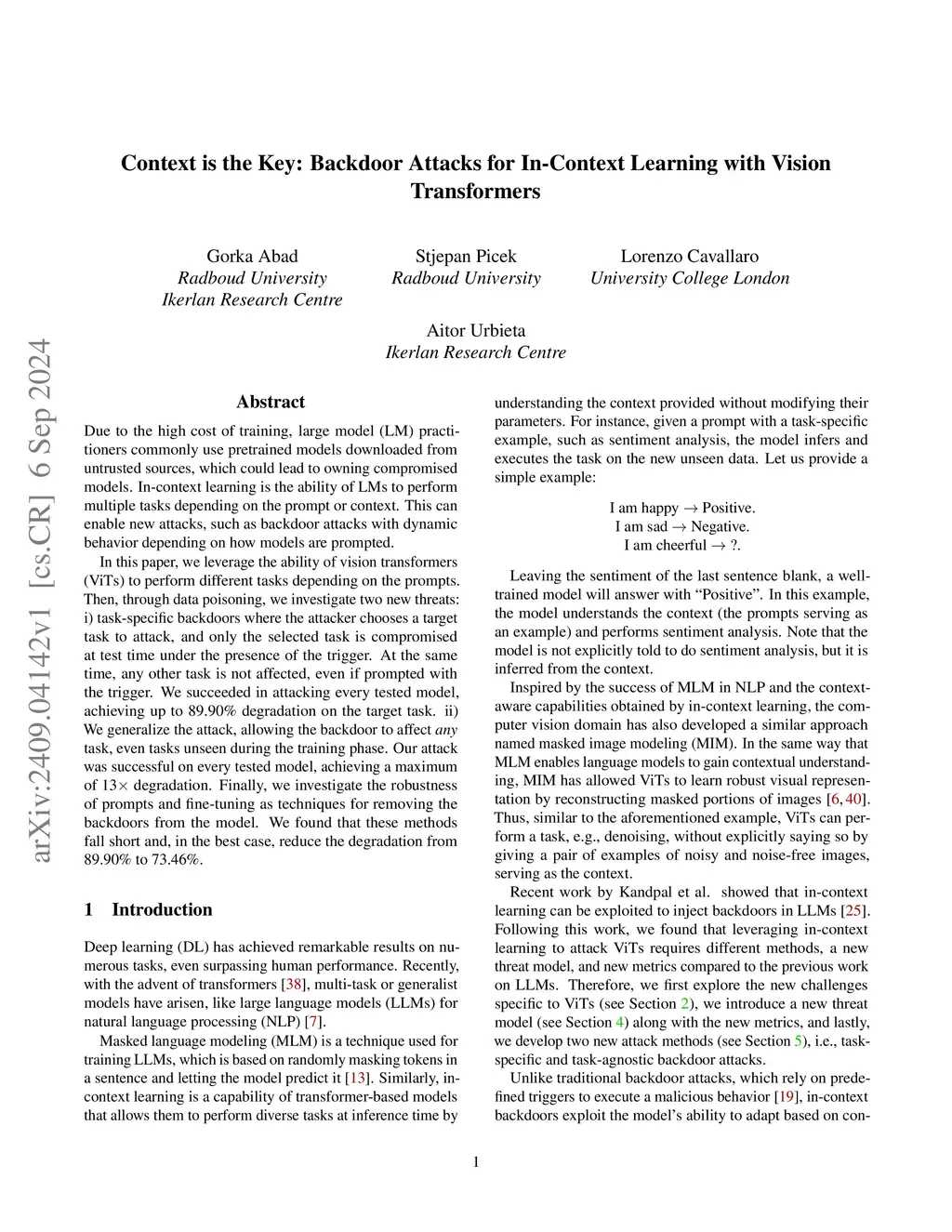Due to the high cost of training, large model (LM) practitioners commonly use pretrained models downloaded from untrusted sources, which could lead to owning compromised models. In-context learning is the ability of LMs to perform multiple tasks depending on the prompt or context. This can enable new attacks, such as backdoor attacks with dynamic behavior depending on how models are prompted. In this paper, we leverage the ability of vision transformers (ViTs) to perform different tasks depending on the prompts. Then, through data poisoning, we investigate two new threats: i) task-specific backdoors where the attacker chooses a target task to attack, and only the selected task is compromised at test time under the presence of the trigger. At the same time, any other task is not affected, even if prompted with the trigger. We succeeded in attacking every tested model, achieving up to 89.90\% degradation on the target task. ii) We generalize the attack, allowing the backdoor to affect \emph{any} task, even tasks unseen during the training phase. Our attack was successful on every tested model, achieving a maximum of degradation. Finally, we investigate the robustness of prompts and fine-tuning as techniques for removing the backdoors from the model. We found that these methods fall short and, in the best case, reduce the degradation from 89.90\% to 73.46\%.