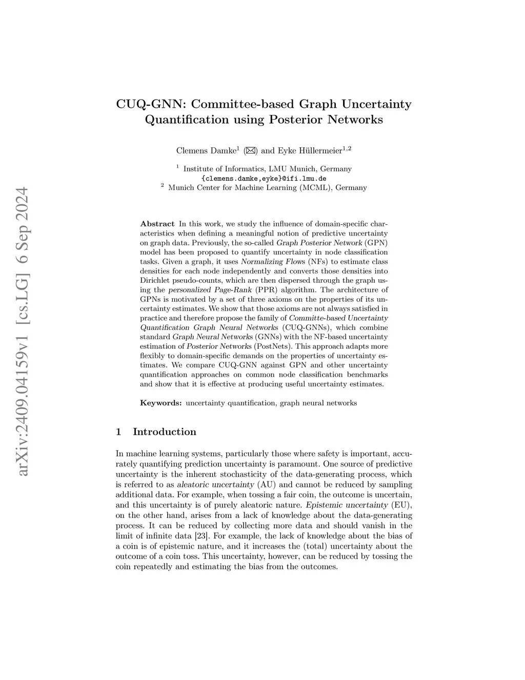 In this work, we study the influence of domain-specific characteristics when defining a meaningful notion of predictive uncertainty on graph data. Previously, the so-called Graph Posterior Network (GPN) model has been proposed to quantify uncertainty in node classification tasks. Given a graph, it uses Normalizing Flows (NFs) to estimate class densities for each node independently and converts those densities into Dirichlet pseudo-counts, which are then dispersed through the graph using the personalized Page-Rank algorithm. The architecture of GPNs is motivated by a set of three axioms on the properties of its uncertainty estimates. We show that those axioms are not always satisfied in practice and therefore propose the family of Committe-based Uncertainty Quantification Graph Neural Networks (CUQ-GNNs), which combine standard Graph Neural Networks with the NF-based uncertainty estimation of Posterior Networks (PostNets). This approach adapts more flexibly to domain-specific demands on the properties of uncertainty estimates. We compare CUQ-GNN against GPN and other uncertainty quantification approaches on common node classification benchmarks and show that it is effective at producing useful uncertainty estimates.