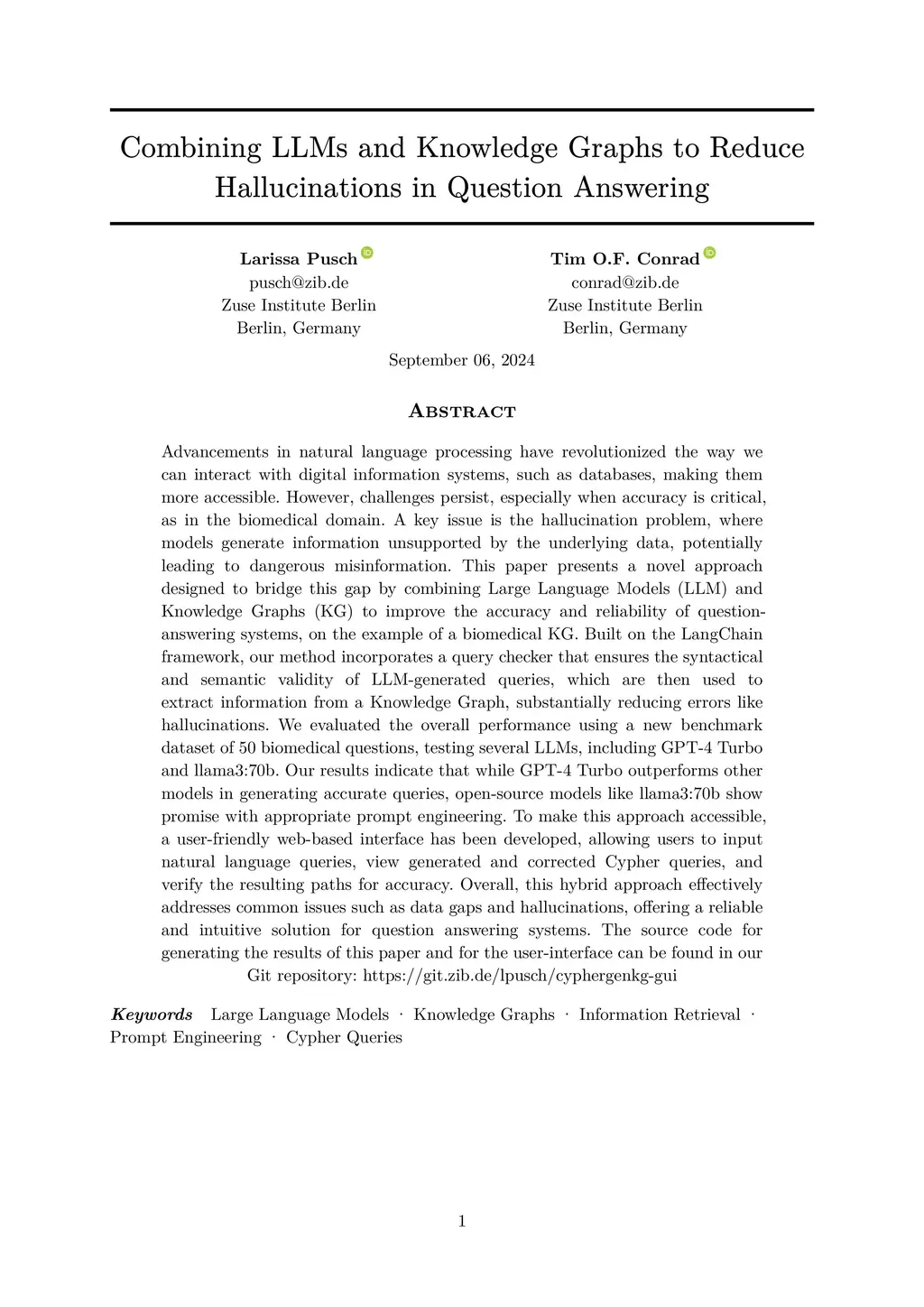 Advancements in natural language processing have revolutionized the way we can interact with digital information systems, such as databases, making them more accessible. However, challenges persist, especially when accuracy is critical, as in the biomedical domain. A key issue is the hallucination problem, where models generate information unsupported by the underlying data, potentially leading to dangerous misinformation. This paper presents a novel approach designed to bridge this gap by combining Large Language Models (LLM) and Knowledge Graphs (KG) to improve the accuracy and reliability of question-answering systems, on the example of a biomedical KG. Built on the LangChain framework, our method incorporates a query checker that ensures the syntactical and semantic validity of LLM-generated queries, which are then used to extract information from a Knowledge Graph, substantially reducing errors like hallucinations. We evaluated the overall performance using a new benchmark dataset of 50 biomedical questions, testing several LLMs, including GPT-4 Turbo and llama3:70b. Our results indicate that while GPT-4 Turbo outperforms other models in generating accurate queries, open-source models like llama3:70b show promise with appropriate prompt engineering. To make this approach accessible, a user-friendly web-based interface has been developed, allowing users to input natural language queries, view generated and corrected Cypher queries, and verify the resulting paths for accuracy. Overall, this hybrid approach effectively addresses common issues such as data gaps and hallucinations, offering a reliable and intuitive solution for question answering systems. The source code for generating the results of this paper and for the user-interface can be found in our Git repository:this https URL