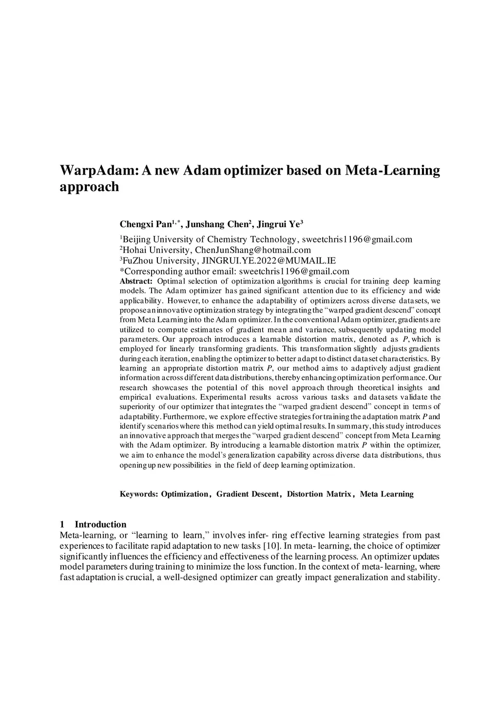 Optimal selection of optimization algorithms is crucial for training deep learning models. The Adam optimizer has gained significant attention due to its efficiency and wide applicability. However, to enhance the adaptability of optimizers across diverse datasets, we propose an innovative optimization strategy by integrating the 'warped gradient descend'concept from Meta Learning into the Adam optimizer. In the conventional Adam optimizer, gradients are utilized to compute estimates of gradient mean and variance, subsequently updating model parameters. Our approach introduces a learnable distortion matrix, denoted as P, which is employed for linearly transforming gradients. This transformation slightly adjusts gradients during each iteration, enabling the optimizer to better adapt to distinct dataset characteristics. By learning an appropriate distortion matrix P, our method aims to adaptively adjust gradient information across different data distributions, thereby enhancing optimization performance. Our research showcases the potential of this novel approach through theoretical insights and empirical evaluations. Experimental results across various tasks and datasets validate the superiority of our optimizer that integrates the 'warped gradient descend' concept in terms of adaptability. Furthermore, we explore effective strategies for training the adaptation matrix P and identify scenarios where this method can yield optimal results. In summary, this study introduces an innovative approach that merges the 'warped gradient descend' concept from Meta Learning with the Adam optimizer. By introducing a learnable distortion matrix P within the optimizer, we aim to enhance the model's generalization capability across diverse data distributions, thus opening up new possibilities in the field of deep learning optimization.