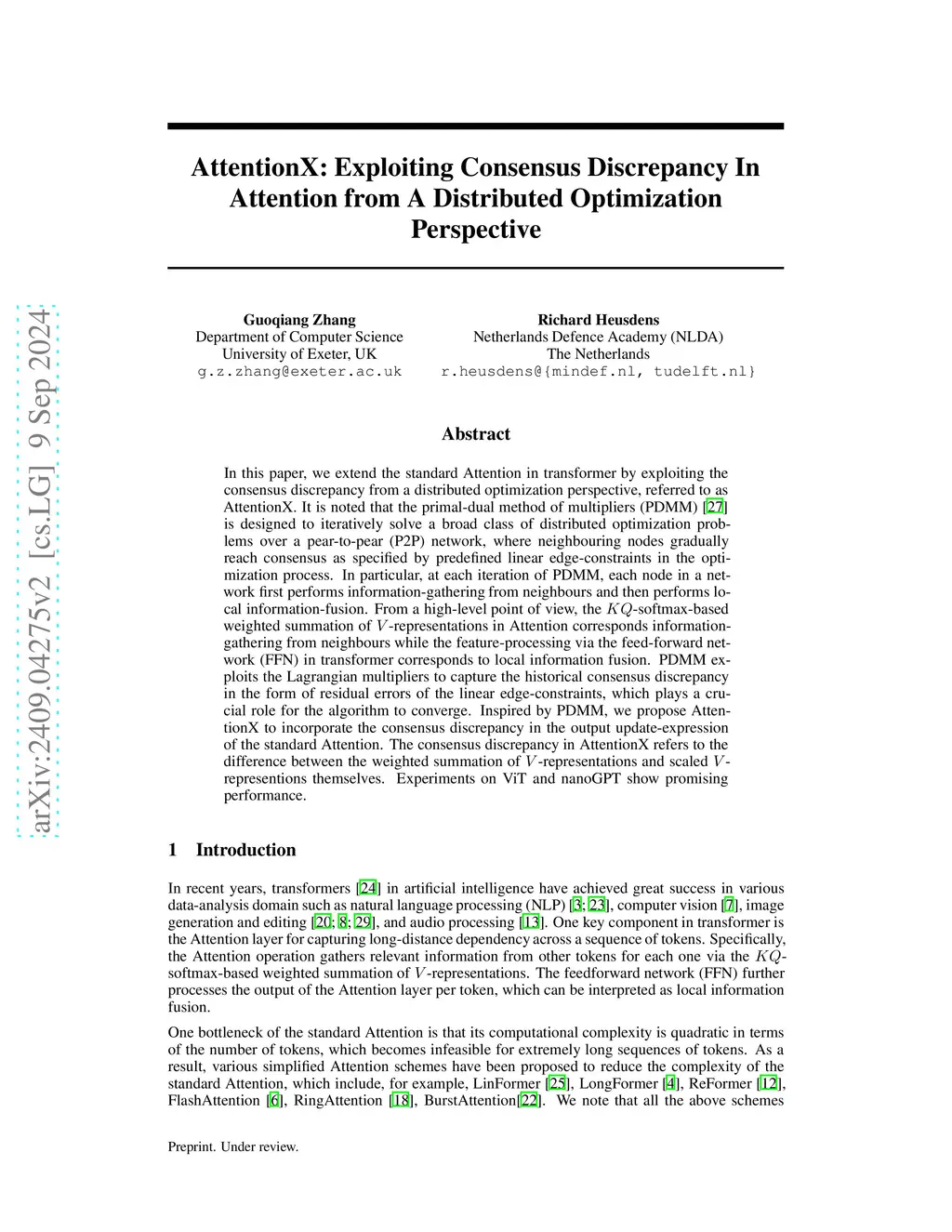 In this paper, we extend the standard Attention in transformer by exploiting the consensus discrepancy from a distributed optimization perspective, referred to as AttentionX. It is noted that the primal-dual method of multipliers (PDMM) \cite{Zhang16PDMM} is designed to iteratively solve a broad class of distributed optimization problems over a pear-to-pear (P2P) network, where neighbouring nodes gradually reach consensus as specified by predefined linear edge-constraints in the optimization process. In particular, at each iteration of PDMM, each node in a network first performs information-gathering from neighbours and then performs local information-fusion. From a high-level point of view, the -softmax-based weighted summation of -representations in Attention corresponds information-gathering from neighbours while the feature-processing via the feed-forward network (FFN) in transformer corresponds to local information fusion. PDMM exploits the Lagrangian multipliers to capture the historical consensus discrepancy in the form of residual errors of the linear edge-constraints, which plays a crucial role for the algorithm to converge. Inspired by PDMM, we propose AttentionX to incorporate the consensus discrepancy in the output update-expression of the standard Attention. The consensus discrepancy in AttentionX refers to the difference between the weighted summation of -representations and scaled -representions themselves. Experiments on ViT and nanoGPT show promising performance.