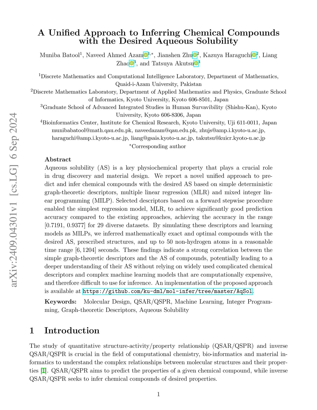 Aqueous solubility (AS) is a key physiochemical property that plays a crucial role in drug discovery and material design. We report a novel unified approach to predict and infer chemical compounds with the desired AS based on simple deterministic graph-theoretic descriptors, multiple linear regression (MLR) and mixed integer linear programming (MILP). Selected descriptors based on a forward stepwise procedure enabled the simplest regression model, MLR, to achieve significantly good prediction accuracy compared to the existing approaches, achieving the accuracy in the range [0.7191, 0.9377] for 29 diverse datasets. By simulating these descriptors and learning models as MILPs, we inferred mathematically exact and optimal compounds with the desired AS, prescribed structures, and up to 50 non-hydrogen atoms in a reasonable time range [6, 1204] seconds. These findings indicate a strong correlation between the simple graph-theoretic descriptors and the AS of compounds, potentially leading to a deeper understanding of their AS without relying on widely used complicated chemical descriptors and complex machine learning models that are computationally expensive, and therefore difficult to use for inference. An implementation of the proposed approach is available at https://github.com/ku-dml/mol-infer/tree/master/AqSol.