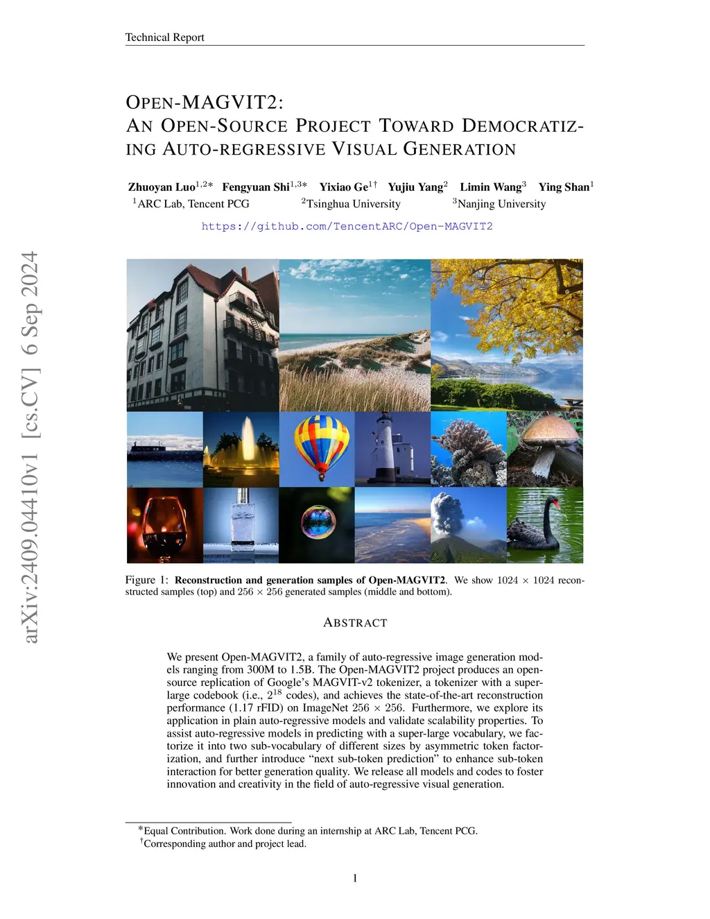 The Open-MAGVIT2 project produces an open-source replication of Google's MAGVIT-v2 tokenizer, a tokenizer with a super-large codebook (i.e., codes), and achieves the state-of-the-art reconstruction performance on ImageNet and UCF benchmarks. We also provide a tokenizer pre-trained on large-scale data, significantly outperforming Cosmos on zero-shot benchmarks (1.93 vs. 0.78 rFID on ImageNet original resolution). Furthermore, we explore its application in plain auto-regressive models to validate scalability properties, producing a family of auto-regressive image generation models ranging from 300M to 1.5B. To assist auto-regressive models in predicting with a super-large vocabulary, we factorize it into two sub-vocabulary of different sizes by asymmetric token factorization, and further introduce ``next sub-token prediction'' to enhance sub-token interaction for better generation quality. We release all models and codes to foster innovation and creativity in the field of auto-regressive visual generation.