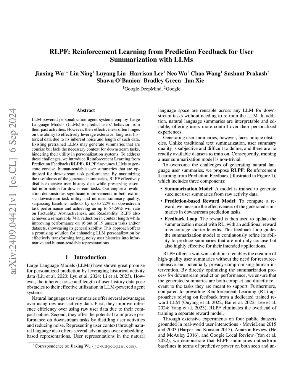 RLPF: Reinforcement Learning from Prediction Feedback for User Summarization with LLMs