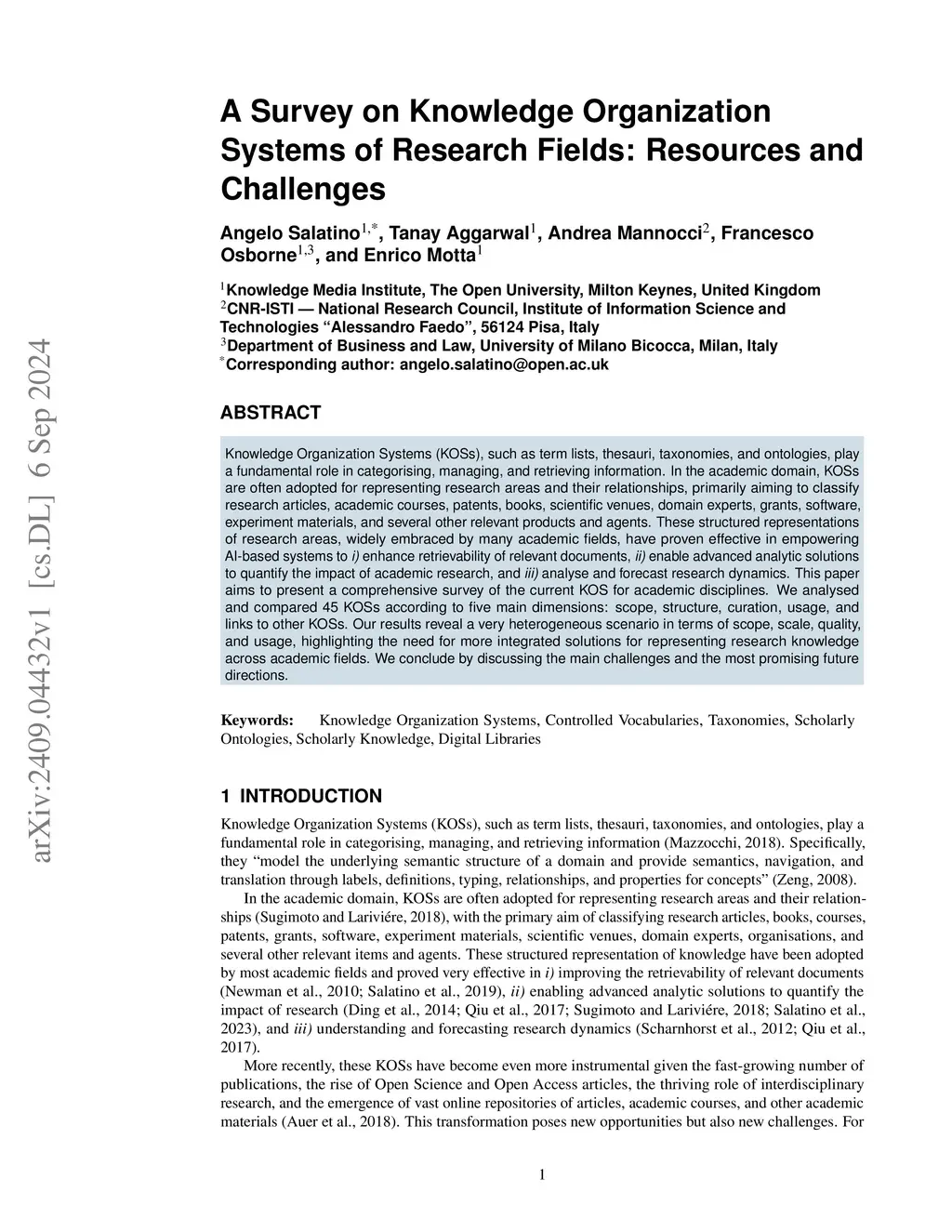 A Survey on Knowledge Organization Systems of Research Fields: Resources and Challenges