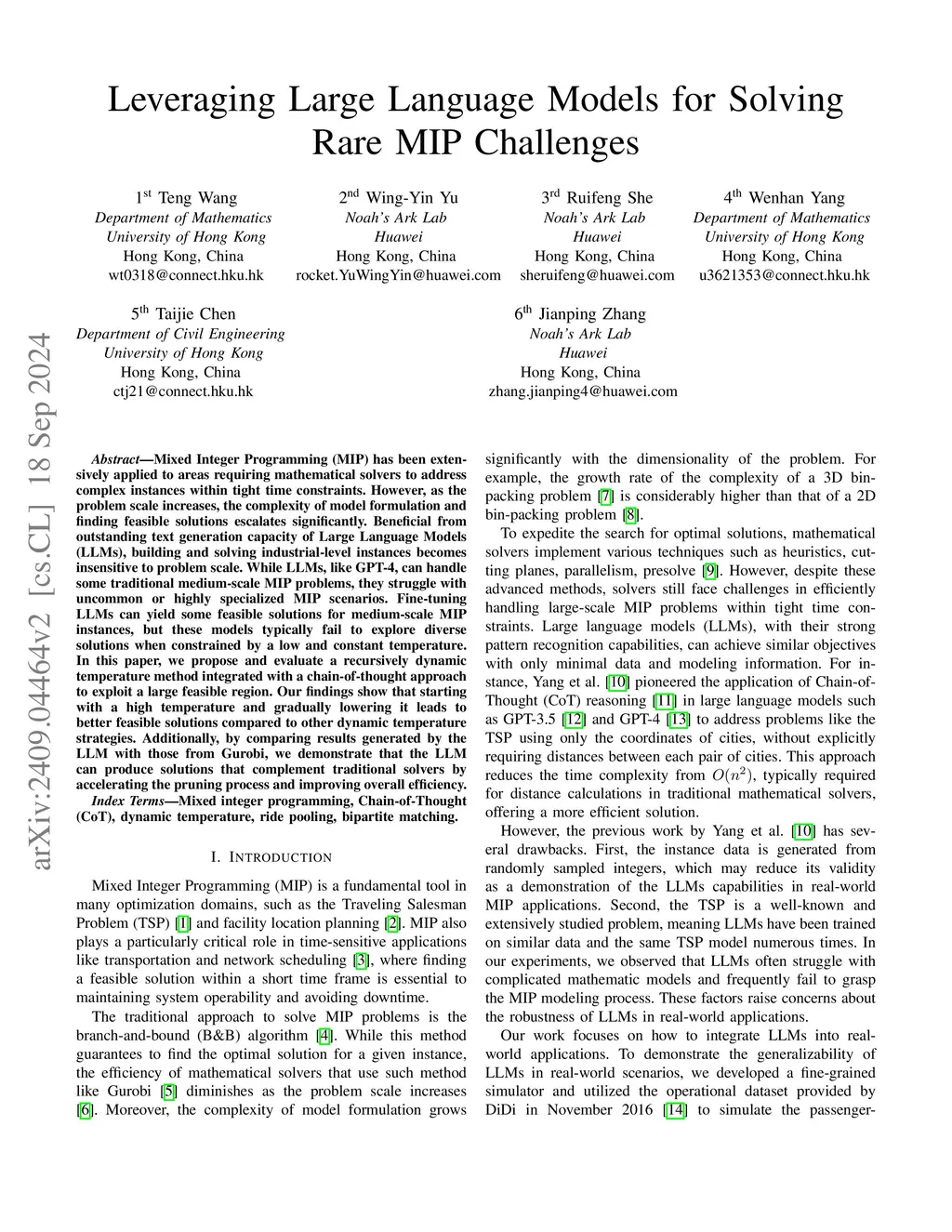 Mixed Integer Programming (MIP) has been extensively applied in areas requiring mathematical solvers to address complex instances within tight time constraints. However, as the problem scale increases, the complexity of model formulation and finding feasible solutions escalates significantly. In contrast, the model-building cost for end-to-end models, such as large language models (LLMs), remains largely unaffected by problem scale due to their pattern recognition capabilities. While LLMs, like GPT-4, without fine-tuning, can handle some traditional medium-scale MIP problems, they struggle with uncommon or highly specialized MIP scenarios. Fine-tuning LLMs can yield some feasible solutions for medium-scale MIP instances, but these models typically fail to explore diverse solutions when constrained by a low and constant temperature, limiting their performance. In this paper, we propose and evaluate a recursively dynamic temperature method integrated with a chain-of-thought approach. Our findings show that starting with a high temperature and gradually lowering it leads to better feasible solutions compared to other dynamic temperature strategies. Additionally, by comparing results generated by the LLM with those from Gurobi, we demonstrate that the LLM can produce solutions that complement traditional solvers by accelerating the pruning process and improving overall efficiency.
