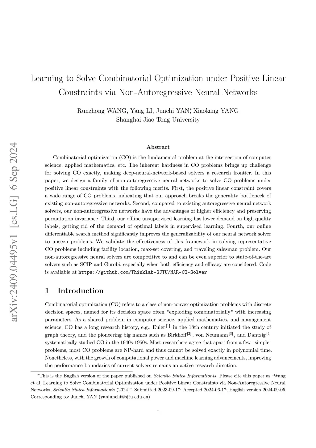 Combinatorial optimization (CO) is the fundamental problem at the intersection of computer science, applied mathematics, etc. The inherent hardness in CO problems brings up challenge for solving CO exactly, making deep-neural-network-based solvers a research frontier. In this paper, we design a family of non-autoregressive neural networks to solve CO problems under positive linear constraints with the following merits. First, the positive linear constraint covers a wide range of CO problems, indicating that our approach breaks the generality bottleneck of existing non-autoregressive networks. Second, compared to existing autoregressive neural network solvers, our non-autoregressive networks have the advantages of higher efficiency and preserving permutation invariance. Third, our offline unsupervised learning has lower demand on high-quality labels, getting rid of the demand of optimal labels in supervised learning. Fourth, our online differentiable search method significantly improves the generalizability of our neural network solver to unseen problems. We validate the effectiveness of this framework in solving representative CO problems including facility location, max-set covering, and traveling salesman problem. Our non-autoregressive neural solvers are competitive to and can be even superior to state-of-the-art solvers such as SCIP and Gurobi, especially when both efficiency and efficacy are considered. Code is available at https://github.com/Thinklab-SJTU/NAR-CO-Solver