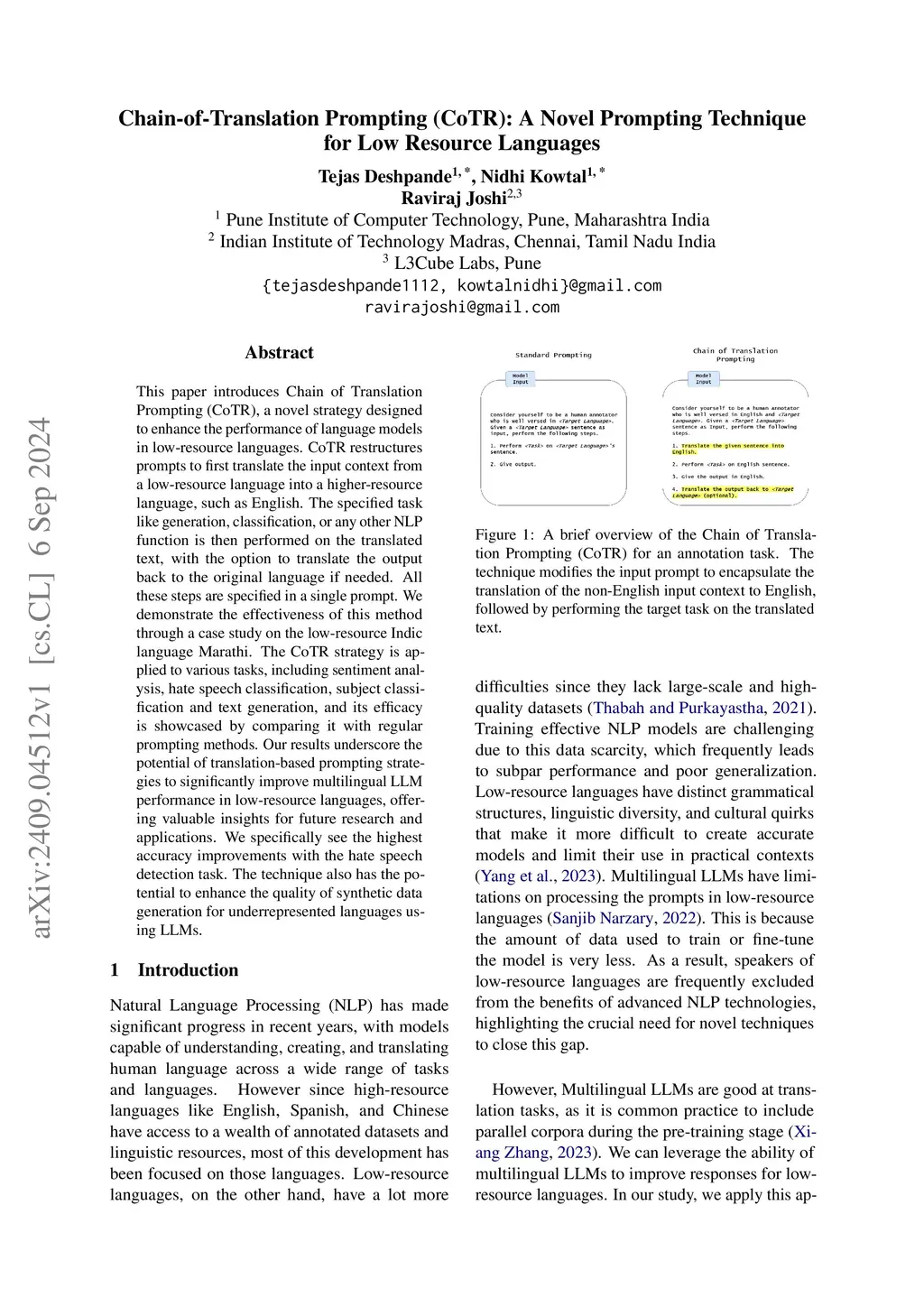 This paper introduces Chain of Translation Prompting (CoTR), a novel strategy designed to enhance the performance of language models in low-resource languages. CoTR restructures prompts to first translate the input context from a low-resource language into a higher-resource language, such as English. The specified task like generation, classification, or any other NLP function is then performed on the translated text, with the option to translate the output back to the original language if needed. All these steps are specified in a single prompt. We demonstrate the effectiveness of this method through a case study on the low-resource Indic language Marathi. The CoTR strategy is applied to various tasks, including sentiment analysis, hate speech classification, subject classification and text generation, and its efficacy is showcased by comparing it with regular prompting methods. Our results underscore the potential of translation-based prompting strategies to significantly improve multilingual LLM performance in low-resource languages, offering valuable insights for future research and applications. We specifically see the highest accuracy improvements with the hate speech detection task. The technique also has the potential to enhance the quality of synthetic data generation for underrepresented languages using LLMs.