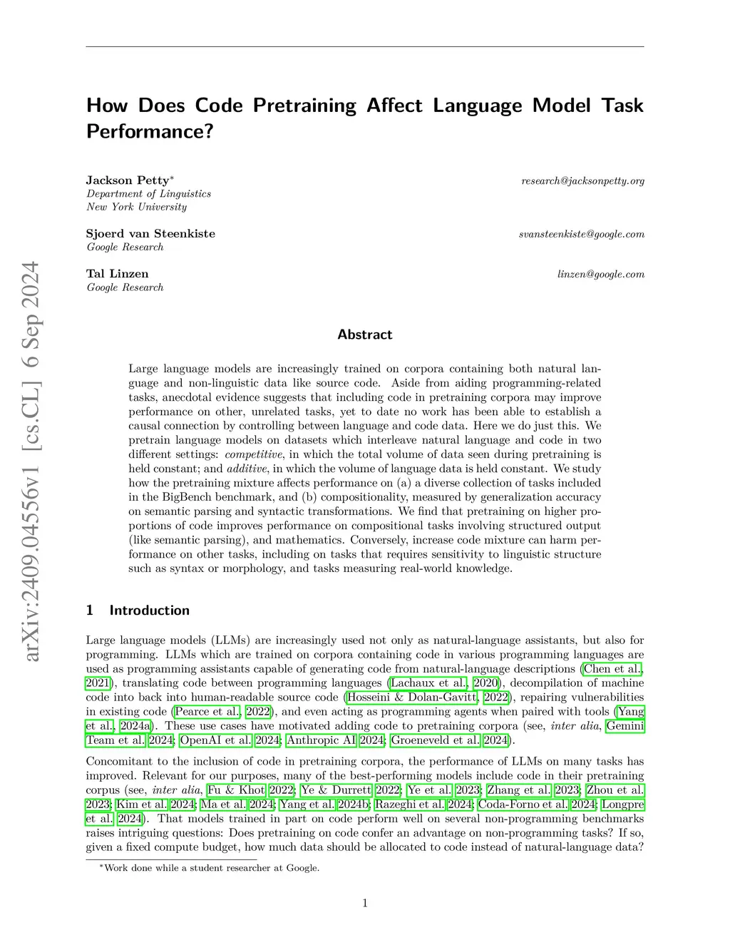 Large language models are increasingly trained on corpora containing both natural language and non-linguistic data like source code. Aside from aiding programming-related tasks, anecdotal evidence suggests that including code in pretraining corpora may improve performance on other, unrelated tasks, yet to date no work has been able to establish a causal connection by controlling between language and code data. Here we do just this. We pretrain language models on datasets which interleave natural language and code in two different settings: additive, in which the total volume of data seen during pretraining is held constant; and competitive, in which the volume of language data is held constant. We study how the pretraining mixture affects performance on (a) a diverse collection of tasks included in the BigBench benchmark, and (b) compositionality, measured by generalization accuracy on semantic parsing and syntactic transformations. We find that pretraining on higher proportions of code improves performance on compositional tasks involving structured output (like semantic parsing), and mathematics. Conversely, increase code mixture can harm performance on other tasks, including on tasks that requires sensitivity to linguistic structure such as syntax or morphology, and tasks measuring real-world knowledge.