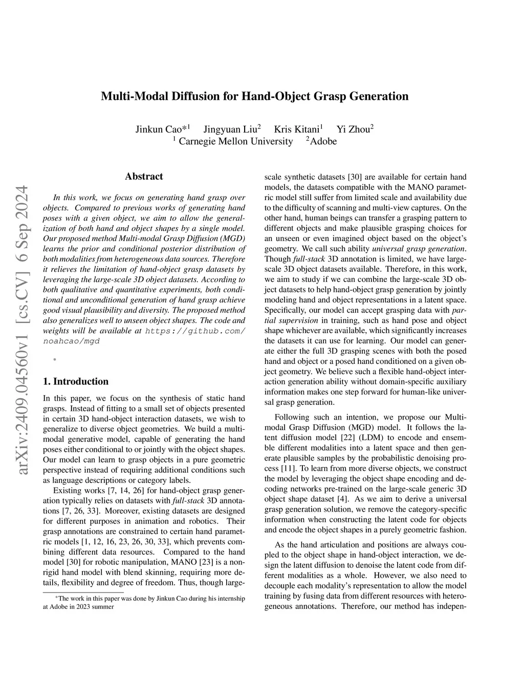 Predicting and generating human hand grasp over objects is critical for animation and robotic tasks. In this work, we focus on generating both the hand and objects in a grasp by a single diffusion model. Our proposed Joint Hand-Object Diffusion (JHOD) models the hand and object in a unified latent representation. It uses the hand-object grasping data to learn to accommodate hand and object to form plausible grasps. Also, to enforce the generalizability over diverse object shapes, it leverages large-scale object datasets to learn an inclusive object latent embedding. With or without a given object as an optional condition, the diffusion model can generate grasps unconditionally or conditional to the object. Compared to the usual practice of learning object-conditioned grasp generation from only hand-object grasp data, our method benefits from more diverse object data used for training to handle grasp generation more universally. According to both qualitative and quantitative experiments, both conditional and unconditional generation of hand grasp achieves good visual plausibility and diversity. With the extra inclusiveness of object representation learned from large-scale object datasets, the proposed method generalizes well to unseen object shapes.