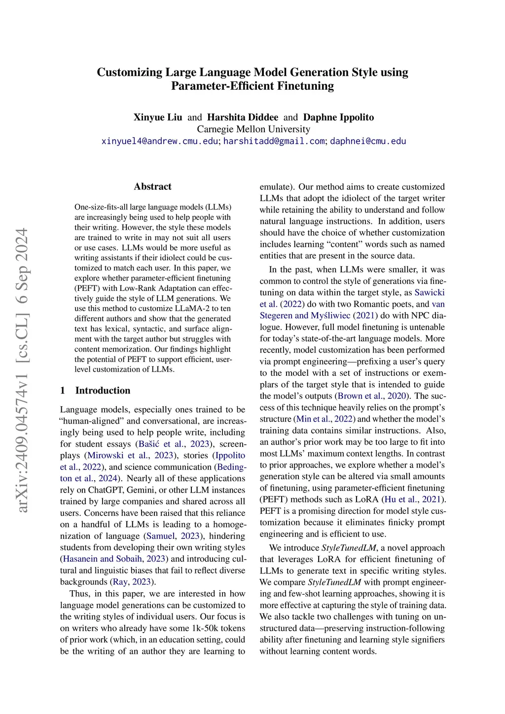One-size-fits-all large language models (LLMs) are increasingly being used to help people with their writing. However, the style these models are trained to write in may not suit all users or use cases. LLMs would be more useful as writing assistants if their idiolect could be customized to match each user. In this paper, we explore whether parameter-efficient finetuning (PEFT) with Low-Rank Adaptation can effectively guide the style of LLM generations. We use this method to customize LLaMA-2 to ten different authors and show that the generated text has lexical, syntactic, and surface alignment with the target author but struggles with content memorization. Our findings highlight the potential of PEFT to support efficient, user-level customization of LLMs.