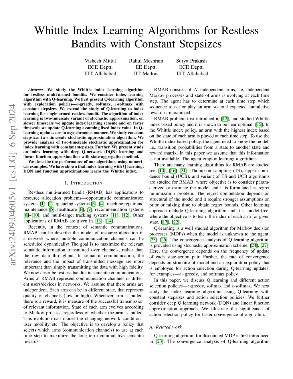 We study the Whittle index learning algorithm for restless multi-armed bandits. We consider index learning algorithm with Q-learning. We first present Q-learning algorithm with exploration policies -- epsilon-greedy, softmax, epsilon-softmax with constant stepsizes. We extend the study of Q-learning to index learning for single-armed restless bandit. The algorithm of index learning is two-timescale variant of stochastic approximation, on slower timescale we update index learning scheme and on faster timescale we update Q-learning assuming fixed index value. In Q-learning updates are in asynchronous manner. We study constant stepsizes two timescale stochastic approximation algorithm. We provide analysis of two-timescale stochastic approximation for index learning with constant stepsizes. Further, we present study on index learning with deep Q-network (DQN) learning and linear function approximation with state-aggregation method. We describe the performance of our algorithms using numerical examples. We have shown that index learning with Q learning, DQN and function approximations learns the Whittle index.