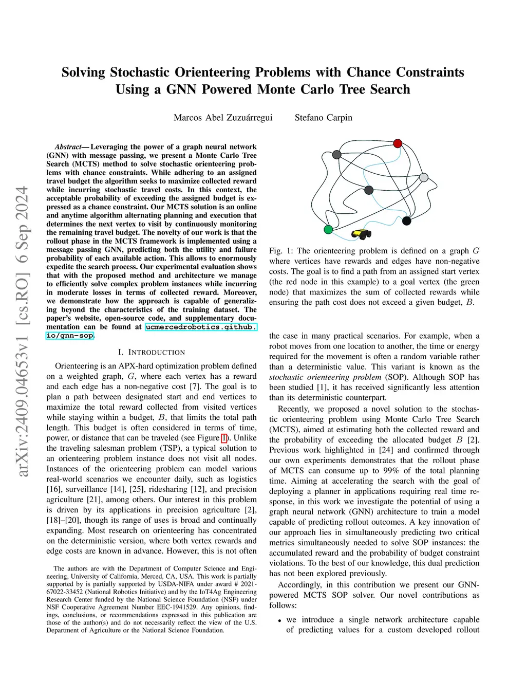 Solving Stochastic Orienteering Problems with Chance Constraints Using a GNN Powered Monte Carlo Tree Search