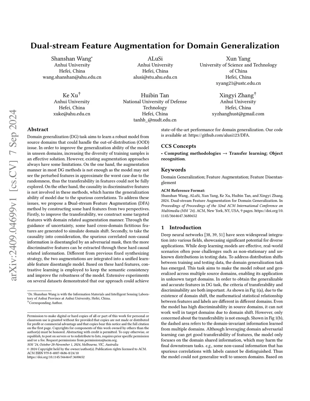 Domain generalization (DG) task aims to learn a robust model from source domains that could handle the out-of-distribution (OOD) issue. In order to improve the generalization ability of the model in unseen domains, increasing the diversity of training samples is an effective solution. However, existing augmentation approaches always have some limitations. On the one hand, the augmentation manner in most DG methods is not enough as the model may not see the perturbed features in approximate the worst case due to the randomness, thus the transferability in features could not be fully explored. On the other hand, the causality in discriminative features is not involved in these methods, which harms the generalization ability of model due to the spurious correlations. To address these issues, we propose a Dual-stream Feature Augmentation~(DFA) method by constructing some hard features from two perspectives. Firstly, to improve the transferability, we construct some targeted features with domain related augmentation manner. Through the guidance of uncertainty, some hard cross-domain fictitious features are generated to simulate domain shift. Secondly, to take the causality into consideration, the spurious correlated non-causal information is disentangled by an adversarial mask, then the more discriminative features can be extracted through these hard causal related information. Different from previous fixed synthesizing strategy, the two augmentations are integrated into a unified learnable feature disentangle model. Based on these hard features, contrastive learning is employed to keep the semantic consistency and improve the robustness of the model. Extensive experiments on several datasets demonstrated that our approach could achieve state-of-the-art performance for domain generalization. Our code is available at: https://github.com/alusi123/DFA.