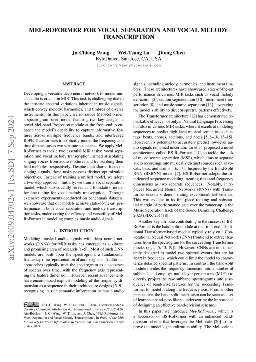 Mel-RoFormer for Vocal Separation and Vocal Melody Transcription