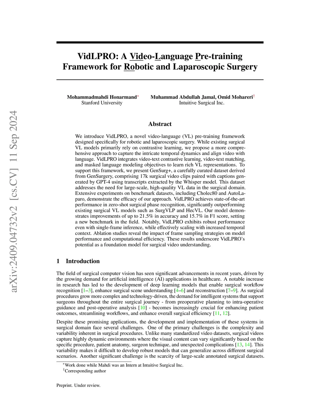 We introduce VidLPRO, a novel video-language (VL) pre-training framework designed specifically for robotic and laparoscopic surgery. While existing surgical VL models primarily rely on contrastive learning, we propose a more comprehensive approach to capture the intricate temporal dynamics and align video with language. VidLPRO integrates video-text contrastive learning, video-text matching, and masked language modeling objectives to learn rich VL representations. To support this framework, we present GenSurg+, a carefully curated dataset derived from GenSurgery, comprising 17k surgical video clips paired with captions generated by GPT-4 using transcripts extracted by the Whisper model. This dataset addresses the need for large-scale, high-quality VL data in the surgical domain. Extensive experiments on benchmark datasets, including Cholec80 and AutoLaparo, demonstrate the efficacy of our approach. VidLPRO achieves state-of-the-art performance in zero-shot surgical phase recognition, significantly outperforming existing surgical VL models such as SurgVLP and HecVL. Our model demonstrates improvements of up to 21.5\% in accuracy and 15.7% in F1 score, setting a new benchmark in the field. Notably, VidLPRO exhibits robust performance even with single-frame inference, while effectively scaling with increased temporal context. Ablation studies reveal the impact of frame sampling strategies on model performance and computational efficiency. These results underscore VidLPRO's potential as a foundation model for surgical video understanding.