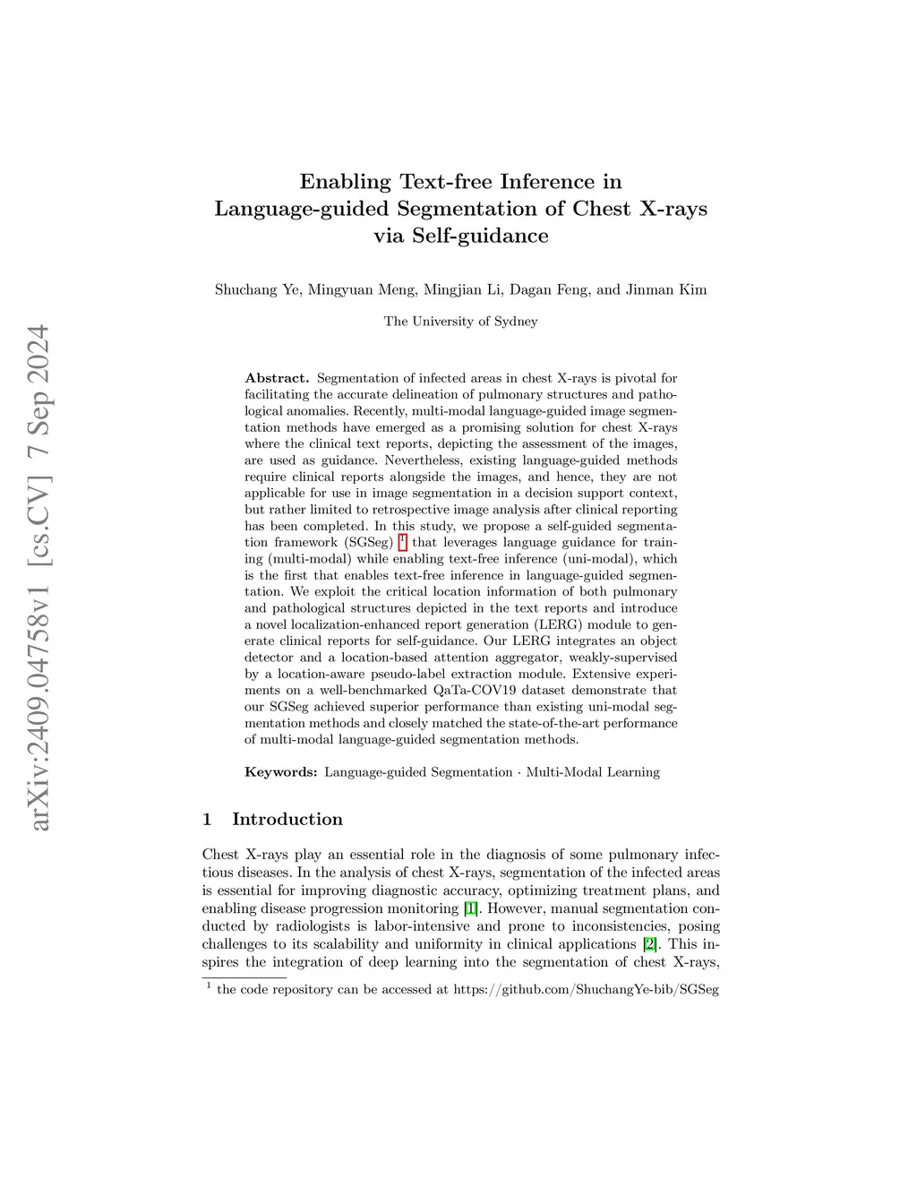Segmentation of infected areas in chest X-rays is pivotal for facilitating the accurate delineation of pulmonary structures and pathological anomalies. Recently, multi-modal language-guided image segmentation methods have emerged as a promising solution for chest X-rays where the clinical text reports, depicting the assessment of the images, are used as guidance. Nevertheless, existing language-guided methods require clinical reports alongside the images, and hence, they are not applicable for use in image segmentation in a decision support context, but rather limited to retrospective image analysis after clinical reporting has been completed. In this study, we propose a self-guided segmentation framework (SGSeg) that leverages language guidance for training (multi-modal) while enabling text-free inference (uni-modal), which is the first that enables text-free inference in language-guided segmentation. We exploit the critical location information of both pulmonary and pathological structures depicted in the text reports and introduce a novel localization-enhanced report generation (LERG) module to generate clinical reports for self-guidance. Our LERG integrates an object detector and a location-based attention aggregator, weakly-supervised by a location-aware pseudo-label extraction module. Extensive experiments on a well-benchmarked QaTa-COV19 dataset demonstrate that our SGSeg achieved superior performance than existing uni-modal segmentation methods and closely matched the state-of-the-art performance of multi-modal language-guided segmentation methods.