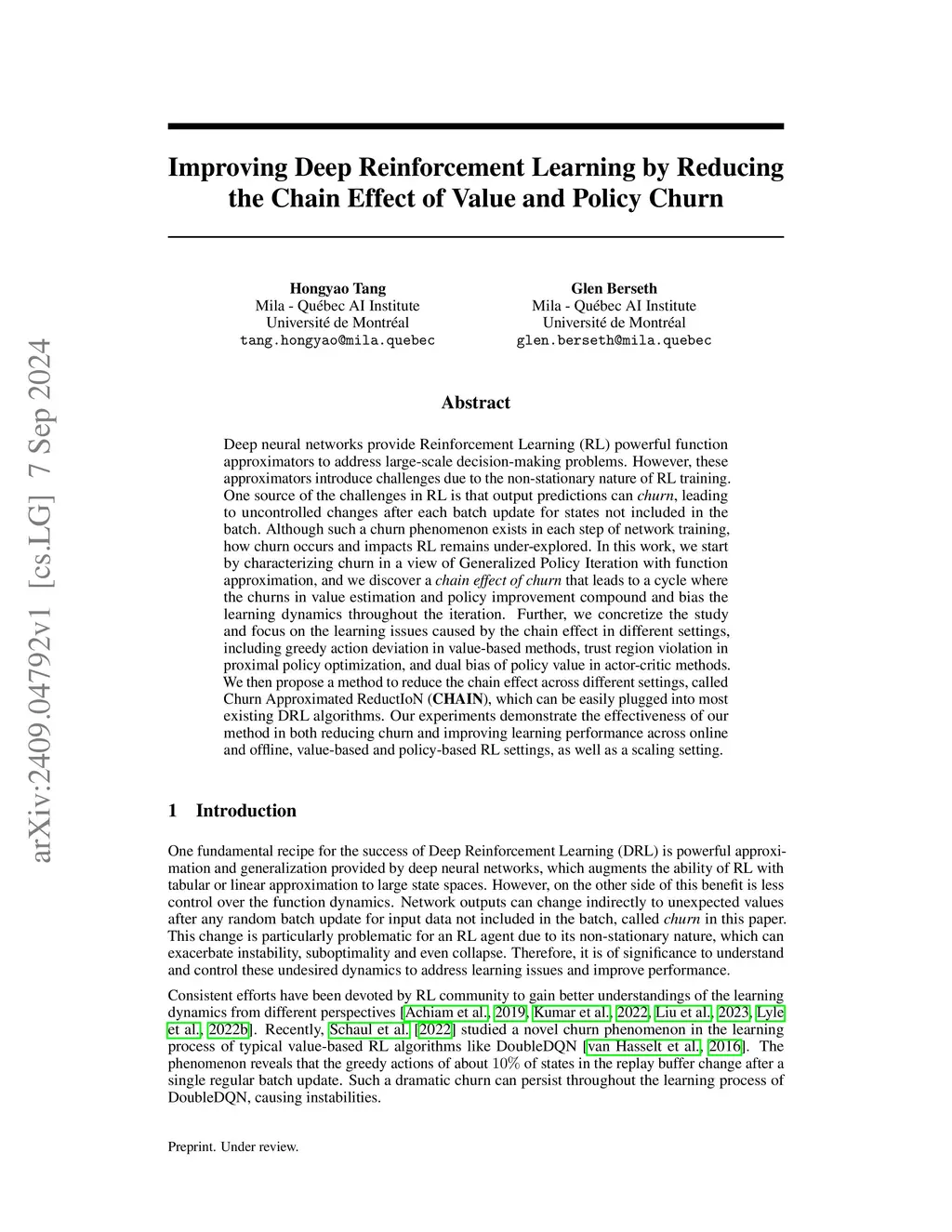 Deep neural networks provide Reinforcement Learning (RL) powerful function approximators to address large-scale decision-making problems. However, these approximators introduce challenges due to the non-stationary nature of RL training. One source of the challenges in RL is that output predictions can churn, leading to uncontrolled changes after each batch update for states not included in the batch. Although such a churn phenomenon exists in each step of network training, how churn occurs and impacts RL remains under-explored. In this work, we start by characterizing churn in a view of Generalized Policy Iteration with function approximation, and we discover a chain effect of churn that leads to a cycle where the churns in value estimation and policy improvement compound and bias the learning dynamics throughout the iteration. Further, we concretize the study and focus on the learning issues caused by the chain effect in different settings, including greedy action deviation in value-based methods, trust region violation in proximal policy optimization, and dual bias of policy value in actor-critic methods. We then propose a method to reduce the chain effect across different settings, called Churn Approximated ReductIoN (CHAIN), which can be easily plugged into most existing DRL algorithms. Our experiments demonstrate the effectiveness of our method in both reducing churn and improving learning performance across online and offline, value-based and policy-based RL settings, as well as a scaling setting.