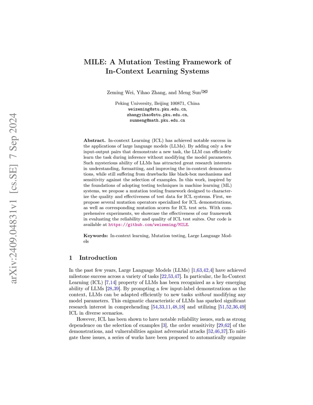 MILE: A Mutation Testing Framework of In-Context Learning Systems