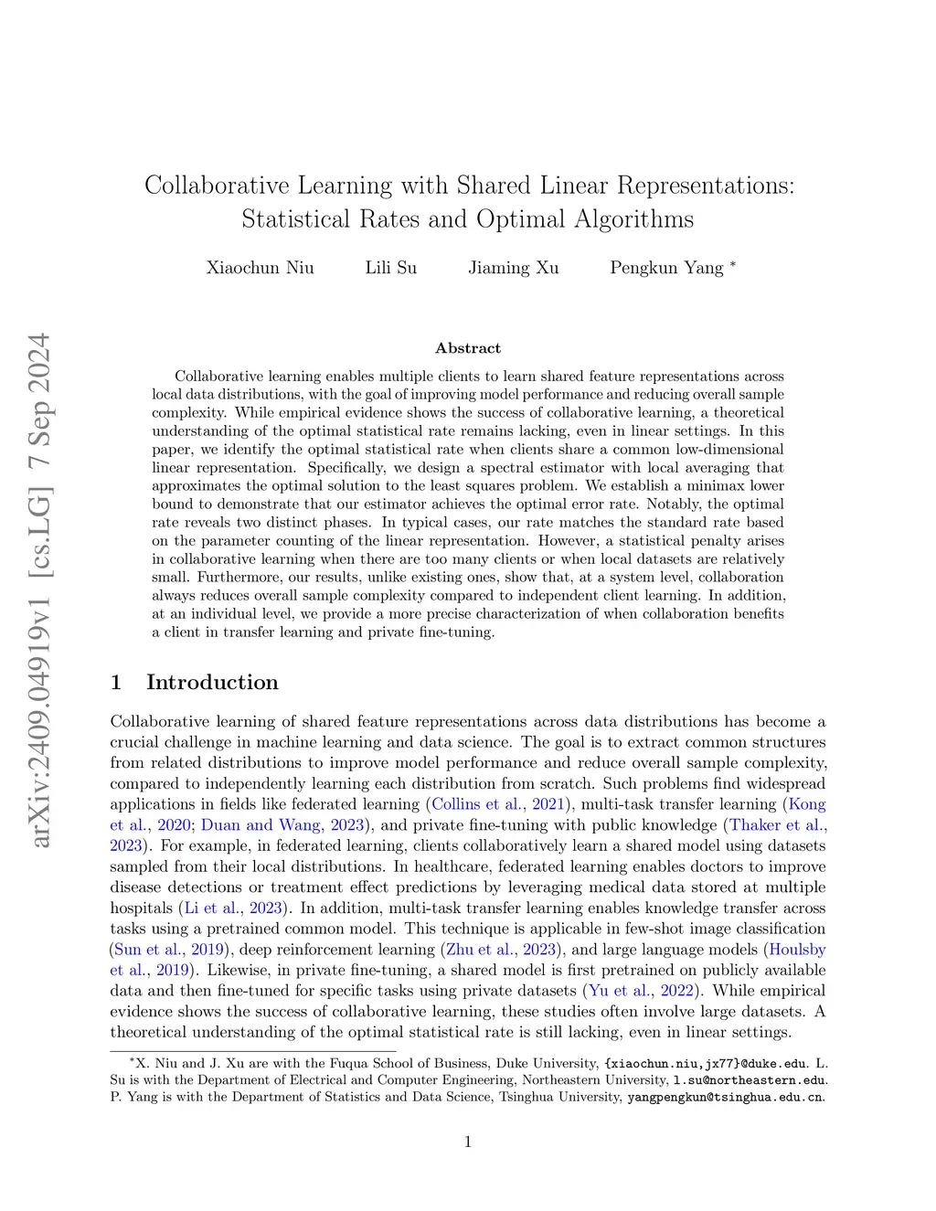 Collaborative learning through latent shared feature representations enables heterogeneous clients to train personalized models with improved performance and reduced sample complexity. Despite empirical success and extensive study, the theoretical understanding of such methods remains incomplete, even for representations restricted to low-dimensional linear subspaces. In this work, we establish new upper and lower bounds on the statistical error in learning low-dimensional shared representations across clients. Our analysis captures both statistical heterogeneity (including covariate and concept shifts) and variation in local dataset sizes, aspects often overlooked in prior work. We further extend these results to nonlinear models including logistic regression and one-hidden-layer ReLU networks.Specifically, we design a spectral estimator that leverages independent replicas of local averages to approximate the non-convex least-squares solution and derive a nearly matching minimax lower bound. Our estimator achieves the optimal statistical rate when the shared representation is well covered across clients -- i.e., when no direction is severely underrepresented. Our results reveal two distinct phases of the optimal rate: a standard parameter-counting regime and a penalized regime when the number of clients is large or local datasets are small. These findings precisely characterize when collaboration benefits the overall system or individual clients in transfer learning and private fine-tuning.