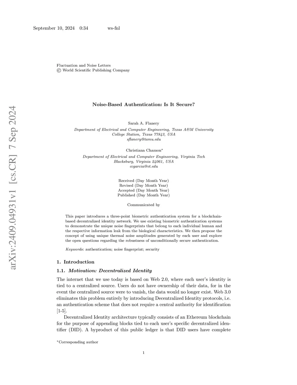 This paper introduces a three-point biometric authentication system for a blockchain-based decentralized identity network. We use existing biometric authentication systems to demonstrate the unique noise fingerprints that belong to each individual human and the respective information leak from the biological characteristics. We then propose the concept of using unique thermal noise amplitudes generated by each user and explore the open questions regarding the robustness of unconditionally secure authentication.