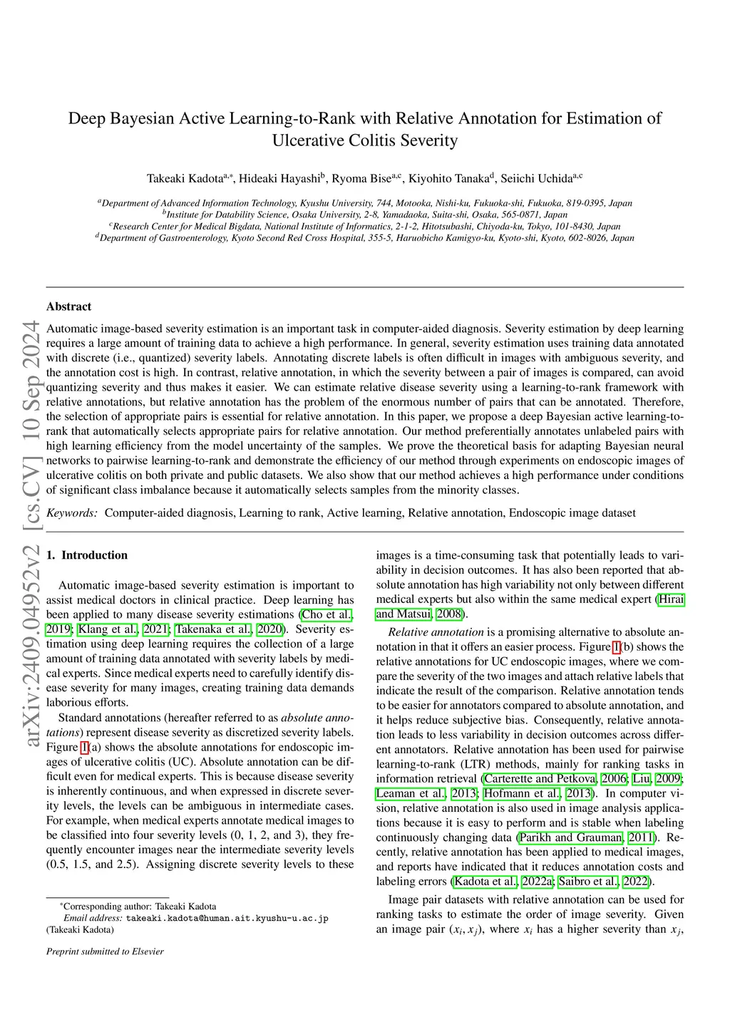 Automatic image-based severity estimation is an important task in computer-aided diagnosis. Severity estimation by deep learning requires a large amount of training data to achieve a high performance. In general, severity estimation uses training data annotated with discrete (i.e., quantized) severity labels. Annotating discrete labels is often difficult in images with ambiguous severity, and the annotation cost is high. In contrast, relative annotation, in which the severity between a pair of images is compared, can avoid quantizing severity and thus makes it easier. We can estimate relative disease severity using a learning-to-rank framework with relative annotations, but relative annotation has the problem of the enormous number of pairs that can be annotated. Therefore, the selection of appropriate pairs is essential for relative annotation. In this paper, we propose a deep Bayesian active learning-to-rank that automatically selects appropriate pairs for relative annotation. Our method preferentially annotates unlabeled pairs with high learning efficiency from the model uncertainty of the samples. We prove the theoretical basis for adapting Bayesian neural networks to pairwise learning-to-rank and demonstrate the efficiency of our method through experiments on endoscopic images of ulcerative colitis on both private and public datasets. We also show that our method achieves a high performance under conditions of significant class imbalance because it automatically selects samples from the minority classes.