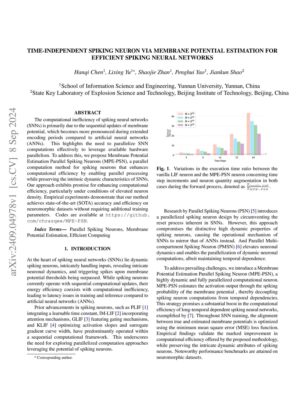 The computational inefficiency of spiking neural networks (SNNs) is primarily due to the sequential updates of membrane potential, which becomes more pronounced during extended encoding periods compared to artificial neural networks (ANNs). This highlights the need to parallelize SNN computations effectively to leverage available hardware parallelism. To address this, we propose Membrane Potential Estimation Parallel Spiking Neurons (MPE-PSN), a parallel computation method for spiking neurons that enhances computational efficiency by enabling parallel processing while preserving the intrinsic dynamic characteristics of SNNs. Our approach exhibits promise for enhancing computational efficiency, particularly under conditions of elevated neuron density. Empirical experiments demonstrate that our method achieves state-of-the-art (SOTA) accuracy and efficiency on neuromorphic datasets. Codes are available at~\url{this https URL}. \end{abstract}