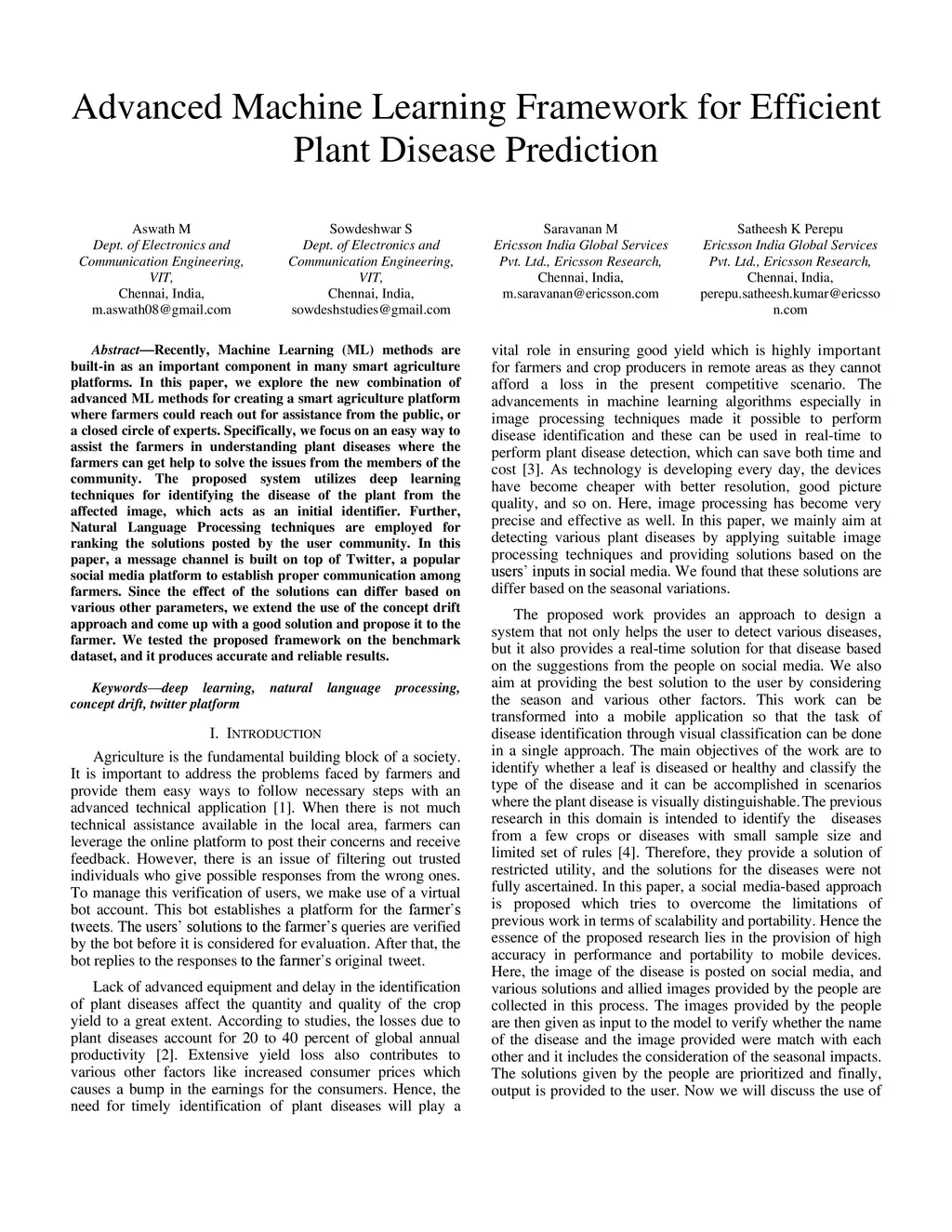Recently, Machine Learning (ML) methods are built-in as an important component in many smart agriculture platforms. In this paper, we explore the new combination of advanced ML methods for creating a smart agriculture platform where farmers could reach out for assistance from the public, or a closed circle of experts. Specifically, we focus on an easy way to assist the farmers in understanding plant diseases where the farmers can get help to solve the issues from the members of the community. The proposed system utilizes deep learning techniques for identifying the disease of the plant from the affected image, which acts as an initial identifier. Further, Natural Language Processing techniques are employed for ranking the solutions posted by the user community. In this paper, a message channel is built on top of Twitter, a popular social media platform to establish proper communication among farmers. Since the effect of the solutions can differ based on various other parameters, we extend the use of the concept drift approach and come up with a good solution and propose it to the farmer. We tested the proposed framework on the benchmark dataset, and it produces accurate and reliable results.