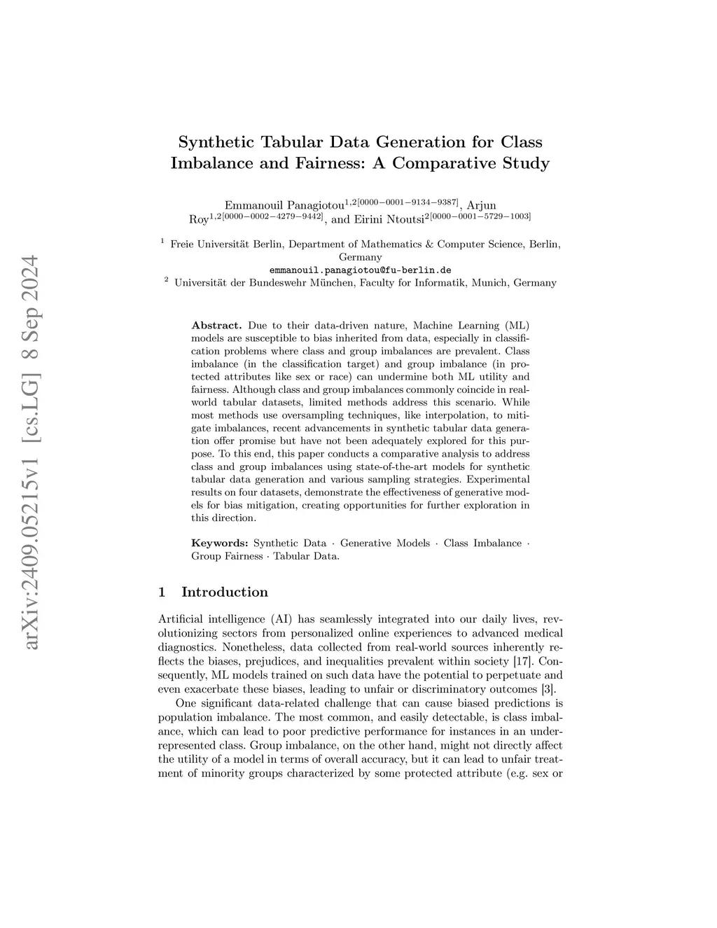 Due to their data-driven nature, Machine Learning (ML) models are susceptible to bias inherited from data, especially in classification problems where class and group imbalances are prevalent. Class imbalance (in the classification target) and group imbalance (in protected attributes like sex or race) can undermine both ML utility and fairness. Although class and group imbalances commonly coincide in real-world tabular datasets, limited methods address this scenario. While most methods use oversampling techniques, like interpolation, to mitigate imbalances, recent advancements in synthetic tabular data generation offer promise but have not been adequately explored for this purpose. To this end, this paper conducts a comparative analysis to address class and group imbalances using state-of-the-art models for synthetic tabular data generation and various sampling strategies. Experimental results on four datasets, demonstrate the effectiveness of generative models for bias mitigation, creating opportunities for further exploration in this direction.