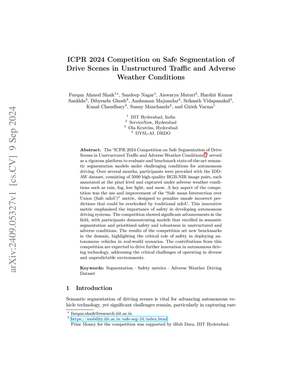 The ICPR 2024 Competition on Safe Segmentation of Drive Scenes in Unstructured Traffic and Adverse Weather Conditions served as a rigorous platform to evaluate and benchmark state-of-the-art semantic segmentation models under challenging conditions for autonomous driving. Over several months, participants were provided with the IDD-AW dataset, consisting of 5000 high-quality RGB-NIR image pairs, each annotated at the pixel level and captured under adverse weather conditions such as rain, fog, low light, and snow. A key aspect of the competition was the use and improvement of the Safe mean Intersection over Union (Safe mIoU) metric, designed to penalize unsafe incorrect predictions that could be overlooked by traditional mIoU. This innovative metric emphasized the importance of safety in developing autonomous driving systems. The competition showed significant advancements in the field, with participants demonstrating models that excelled in semantic segmentation and prioritized safety and robustness in unstructured and adverse conditions. The results of the competition set new benchmarks in the domain, highlighting the critical role of safety in deploying autonomous vehicles in real-world scenarios. The contributions from this competition are expected to drive further innovation in autonomous driving technology, addressing the critical challenges of operating in diverse and unpredictable environments.