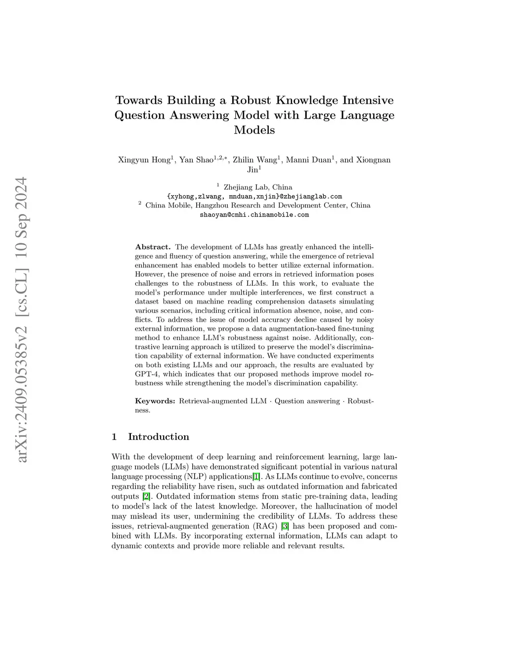 The development of LLMs has greatly enhanced the intelligence and fluency of question answering, while the emergence of retrieval enhancement has enabled models to better utilize external information. However, the presence of noise and errors in retrieved information poses challenges to the robustness of LLMs. In this work, to evaluate the model's performance under multiple interferences, we first construct a dataset based on machine reading comprehension datasets simulating various scenarios, including critical information absence, noise, and conflicts. To address the issue of model accuracy decline caused by noisy external information, we propose a data augmentation-based fine-tuning method to enhance LLM's robustness against noise. Additionally, contrastive learning approach is utilized to preserve the model's discrimination capability of external information. We have conducted experiments on both existing LLMs and our approach, the results are evaluated by GPT-4, which indicates that our proposed methods improve model robustness while strengthening the model's discrimination capability.