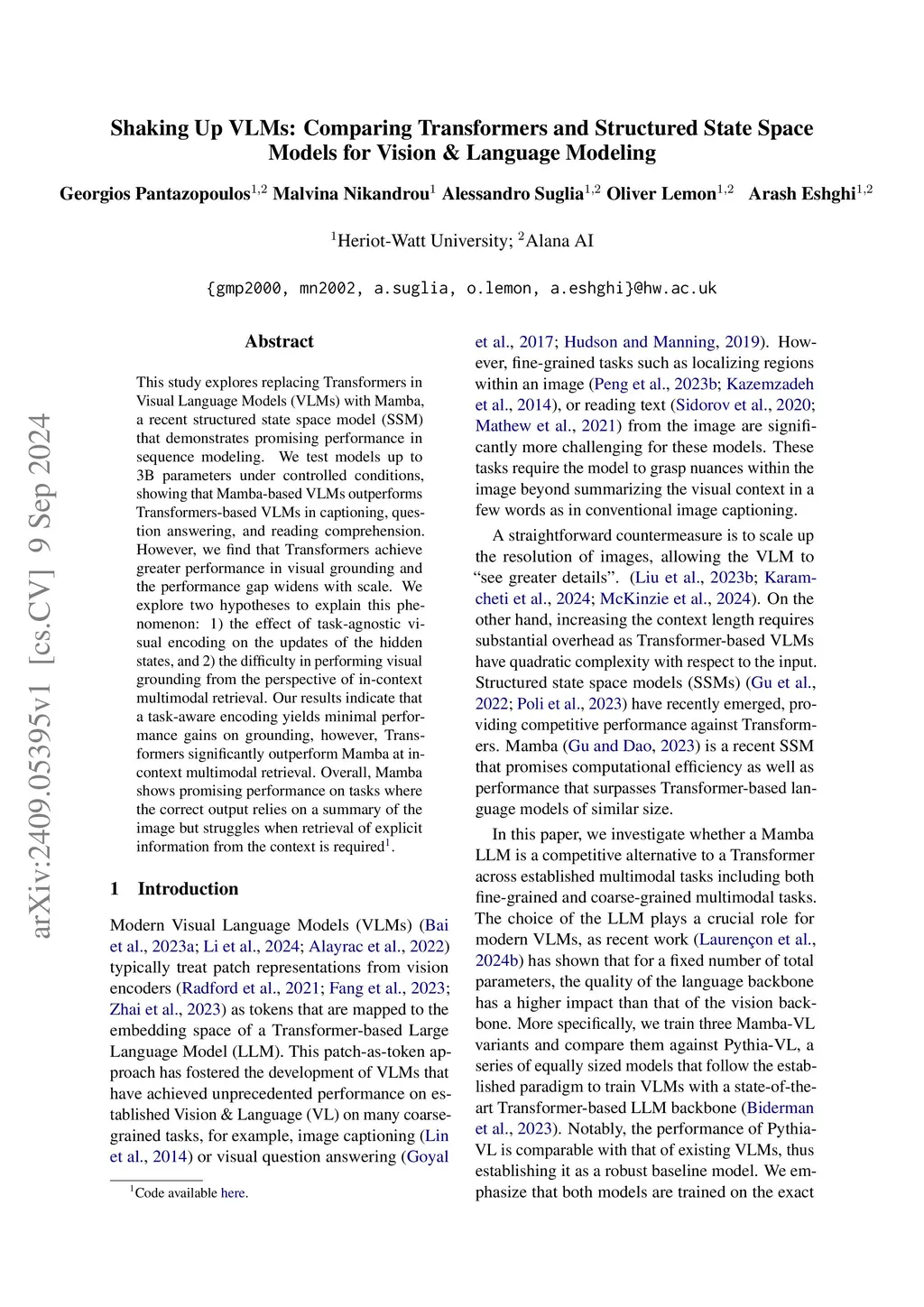 Shaking Up VLMs: Comparing Transformers and Structured State Space Models for Vision & Language Modeling