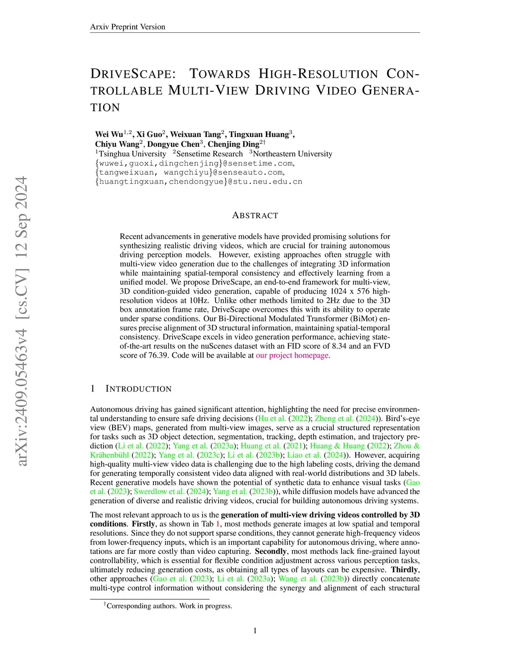 Recent advancements in generative models have provided promising solutions for synthesizing realistic driving videos, which are crucial for training autonomous driving perception models. However, existing approaches often struggle with multi-view video generation due to the challenges of integrating 3D information while maintaining spatial-temporal consistency and effectively learning from a unified model. We propose DriveScape, an end-to-end framework for multi-view, 3D condition-guided video generation, capable of producing 1024 x 576 high-resolution videos at 10Hz. Unlike other methods limited to 2Hz due to the 3D box annotation frame rate, DriveScape overcomes this with its ability to operate under sparse conditions. Our Bi-Directional Modulated Transformer (BiMot) ensures precise alignment of 3D structural information, maintaining spatial-temporal consistency. DriveScape excels in video generation performance, achieving state-of-the-art results on the nuScenes dataset with an FID score of 8.34 and an FVD score of 76.39. Our project homepage: https://metadrivescape.github.io/papers_project/drivescapev1/index.html