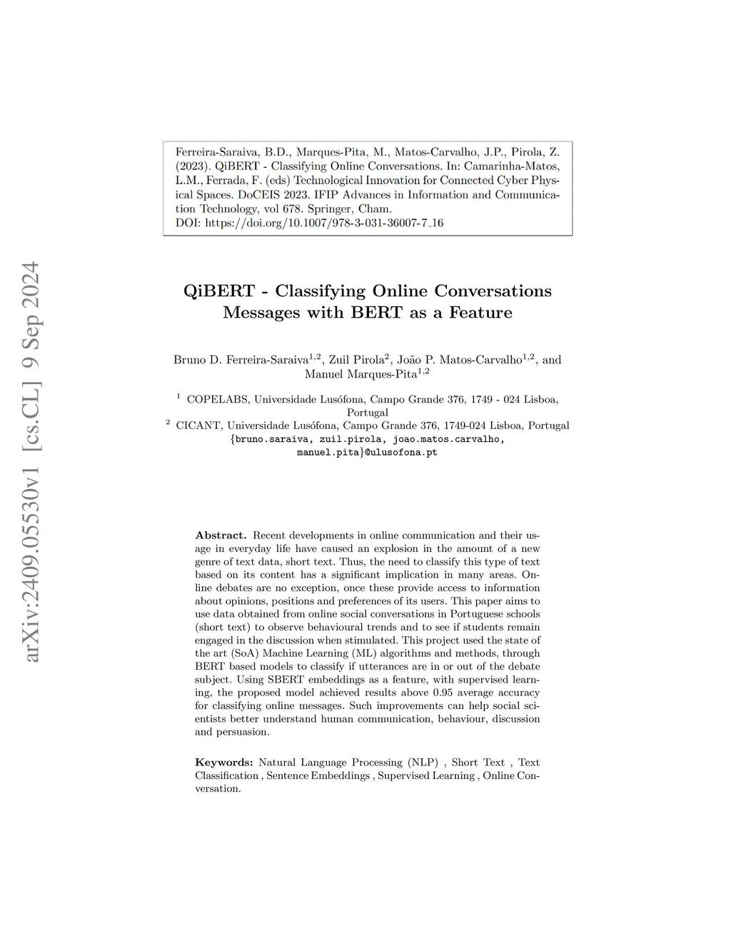 Recent developments in online communication and their usage in everyday life have caused an explosion in the amount of a new genre of text data, short text. Thus, the need to classify this type of text based on its content has a significant implication in many areas. Online debates are no exception, once these provide access to information about opinions, positions and preferences of its users. This paper aims to use data obtained from online social conversations in Portuguese schools (short text) to observe behavioural trends and to see if students remain engaged in the discussion when stimulated. This project used the state of the art (SoA) Machine Learning (ML) algorithms and methods, through BERT based models to classify if utterances are in or out of the debate subject. Using SBERT embeddings as a feature, with supervised learning, the proposed model achieved results above 0.95 average accuracy for classifying online messages. Such improvements can help social scientists better understand human communication, behaviour, discussion and persuasion.