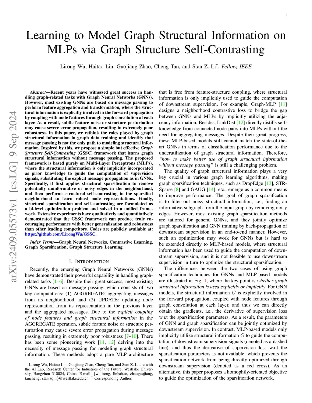 Recent years have witnessed great success in handling graph-related tasks with Graph Neural Networks (GNNs). However, most existing GNNs are based on message passing to perform feature aggregation and transformation, where the structural information is explicitly involved in the forward propagation by coupling with node features through graph convolution at each layer. As a result, subtle feature noise or structure perturbation may cause severe error propagation, resulting in extremely poor robustness. In this paper, we rethink the roles played by graph structural information in graph data training and identify that message passing is not the only path to modeling structural information. Inspired by this, we propose a simple but effective Graph Structure Self-Contrasting (GSSC) framework that learns graph structural information without message passing. The proposed framework is based purely on Multi-Layer Perceptrons (MLPs), where the structural information is only implicitly incorporated as prior knowledge to guide the computation of supervision signals, substituting the explicit message propagation as in GNNs. Specifically, it first applies structural sparsification to remove potentially uninformative or noisy edges in the neighborhood, and then performs structural self-contrasting in the sparsified neighborhood to learn robust node representations. Finally, structural sparsification and self-contrasting are formulated as a bi-level optimization problem and solved in a unified framework. Extensive experiments have qualitatively and quantitatively demonstrated that the GSSC framework can produce truly encouraging performance with better generalization and robustness than other leading competitors.