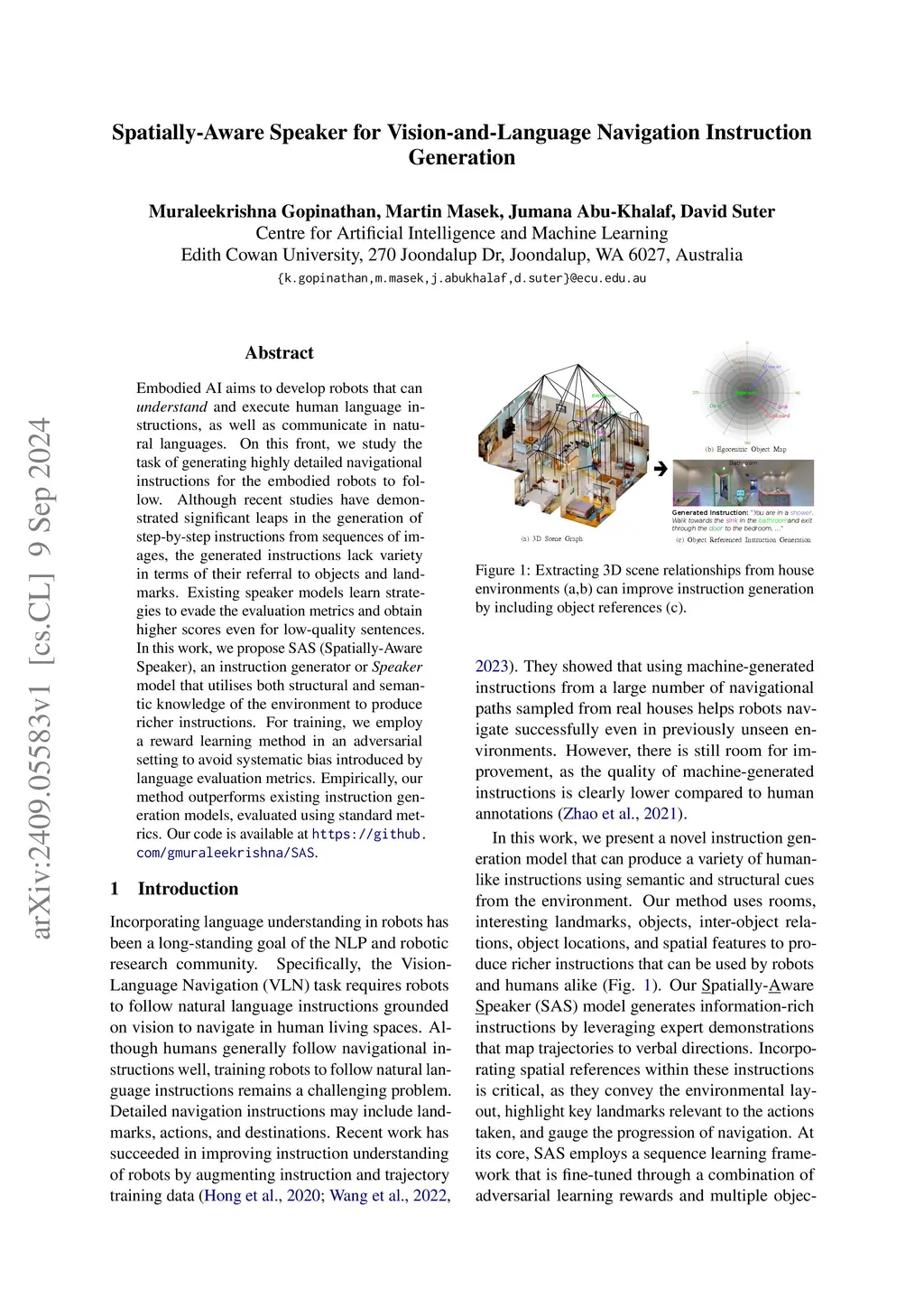 Embodied AI aims to develop robots that can \textit{understand} and execute human language instructions, as well as communicate in natural languages. On this front, we study the task of generating highly detailed navigational instructions for the embodied robots to follow. Although recent studies have demonstrated significant leaps in the generation of step-by-step instructions from sequences of images, the generated instructions lack variety in terms of their referral to objects and landmarks. Existing speaker models learn strategies to evade the evaluation metrics and obtain higher scores even for low-quality sentences. In this work, we propose SAS (Spatially-Aware Speaker), an instruction generator or \textit{Speaker} model that utilises both structural and semantic knowledge of the environment to produce richer instructions. For training, we employ a reward learning method in an adversarial setting to avoid systematic bias introduced by language evaluation metrics. Empirically, our method outperforms existing instruction generation models, evaluated using standard metrics. Our code is available at \url{https://github.com/gmuraleekrishna/SAS}.