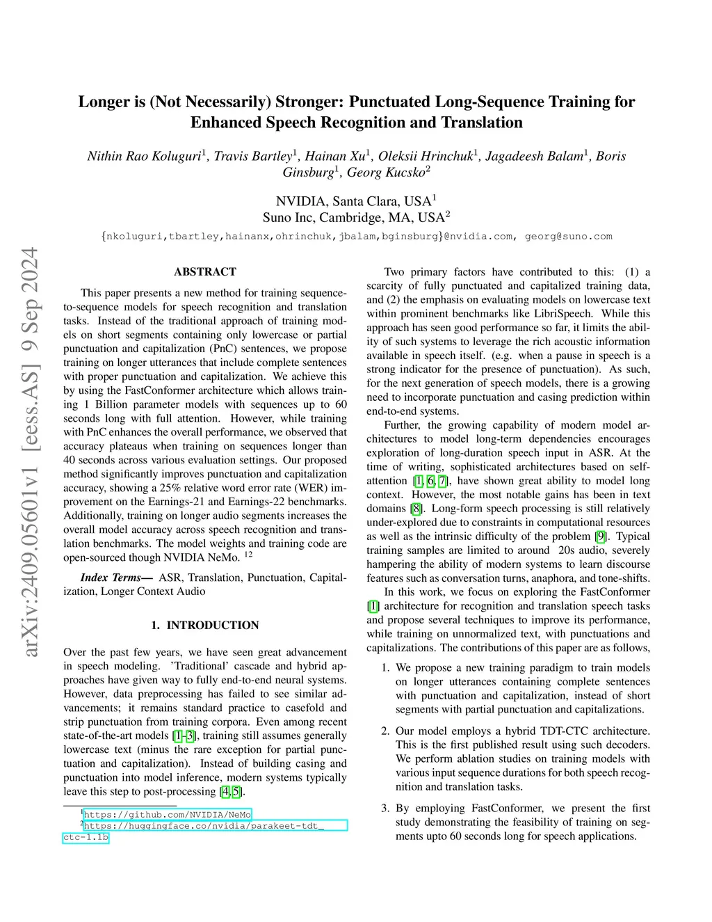 This paper presents a new method for training sequence-to-sequence models for speech recognition and translation tasks. Instead of the traditional approach of training models on short segments containing only lowercase or partial punctuation and capitalization (PnC) sentences, we propose training on longer utterances that include complete sentences with proper punctuation and capitalization. We achieve this by using the FastConformer architecture which allows training 1 Billion parameter models with sequences up to 60 seconds long with full attention. However, while training with PnC enhances the overall performance, we observed that accuracy plateaus when training on sequences longer than 40 seconds across various evaluation settings. Our proposed method significantly improves punctuation and capitalization accuracy, showing a 25% relative word error rate (WER) improvement on the Earnings-21 and Earnings-22 benchmarks. Additionally, training on longer audio segments increases the overall model accuracy across speech recognition and translation benchmarks. The model weights and training code are open-sourced though NVIDIA NeMo.