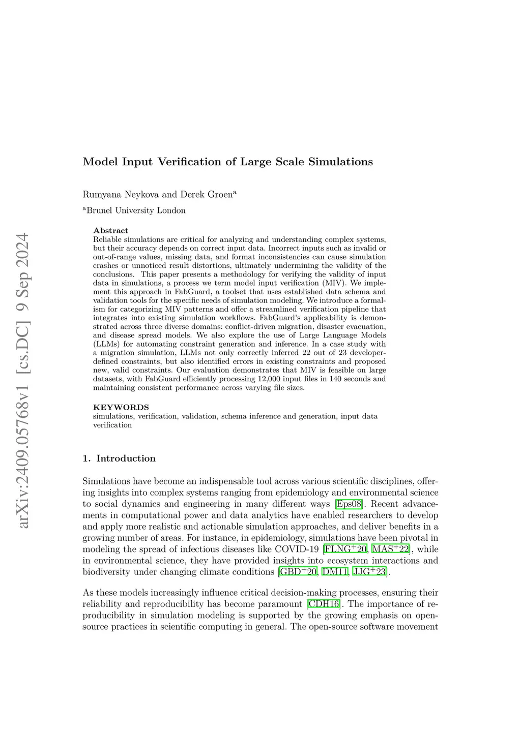 Reliable simulations are critical for analyzing and understanding complex systems, but their accuracy depends on correct input data. Incorrect inputs such as invalid or out-of-range values, missing data, and format inconsistencies can cause simulation crashes or unnoticed result distortions, ultimately undermining the validity of the conclusions. This paper presents a methodology for verifying the validity of input data in simulations, a process we term model input verification (MIV). We implement this approach in FabGuard, a toolset that uses established data schema and validation tools for the specific needs of simulation modeling. We introduce a formalism for categorizing MIV patterns and offer a streamlined verification pipeline that integrates into existing simulation workflows. FabGuard's applicability is demonstrated across three diverse domains: conflict-driven migration, disaster evacuation, and disease spread models. We also explore the use of Large Language Models (LLMs) for automating constraint generation and inference. In a case study with a migration simulation, LLMs not only correctly inferred 22 out of 23 developer-defined constraints, but also identified errors in existing constraints and proposed new, valid constraints. Our evaluation demonstrates that MIV is feasible on large datasets, with FabGuard efficiently processing 12,000 input files in 140 seconds and maintaining consistent performance across varying file sizes.