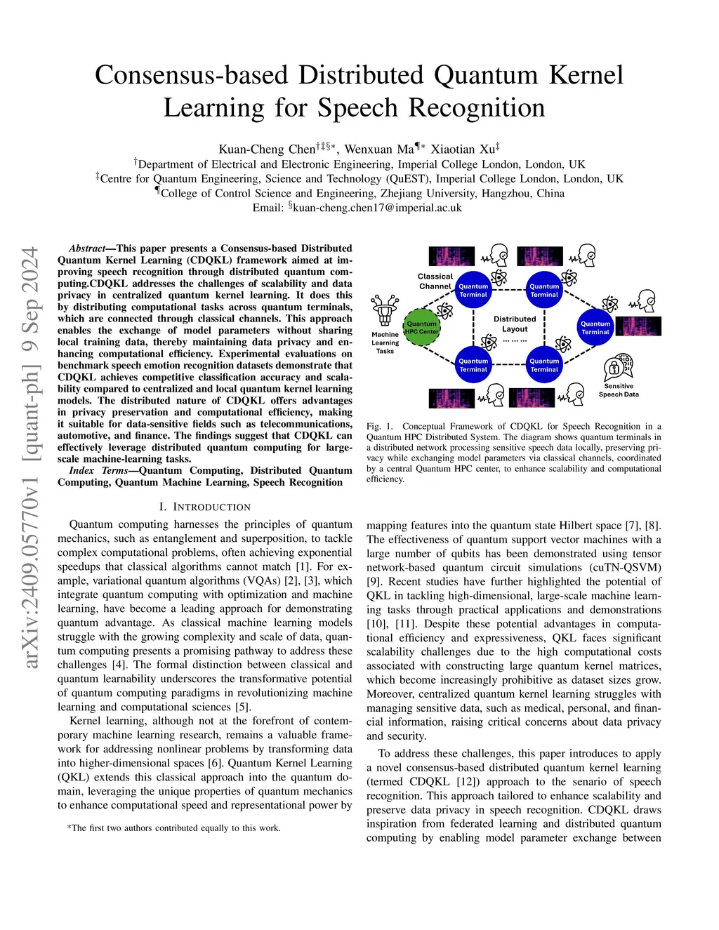 This paper presents a Consensus-based Distributed Quantum Kernel Learning (CDQKL) framework aimed at improving speech recognition through distributed quantum computing.CDQKL addresses the challenges of scalability and data privacy in centralized quantum kernel learning. It does this by distributing computational tasks across quantum terminals, which are connected through classical channels. This approach enables the exchange of model parameters without sharing local training data, thereby maintaining data privacy and enhancing computational efficiency. Experimental evaluations on benchmark speech emotion recognition datasets demonstrate that CDQKL achieves competitive classification accuracy and scalability compared to centralized and local quantum kernel learning models. The distributed nature of CDQKL offers advantages in privacy preservation and computational efficiency, making it suitable for data-sensitive fields such as telecommunications, automotive, and finance. The findings suggest that CDQKL can effectively leverage distributed quantum computing for large-scale machine-learning tasks.