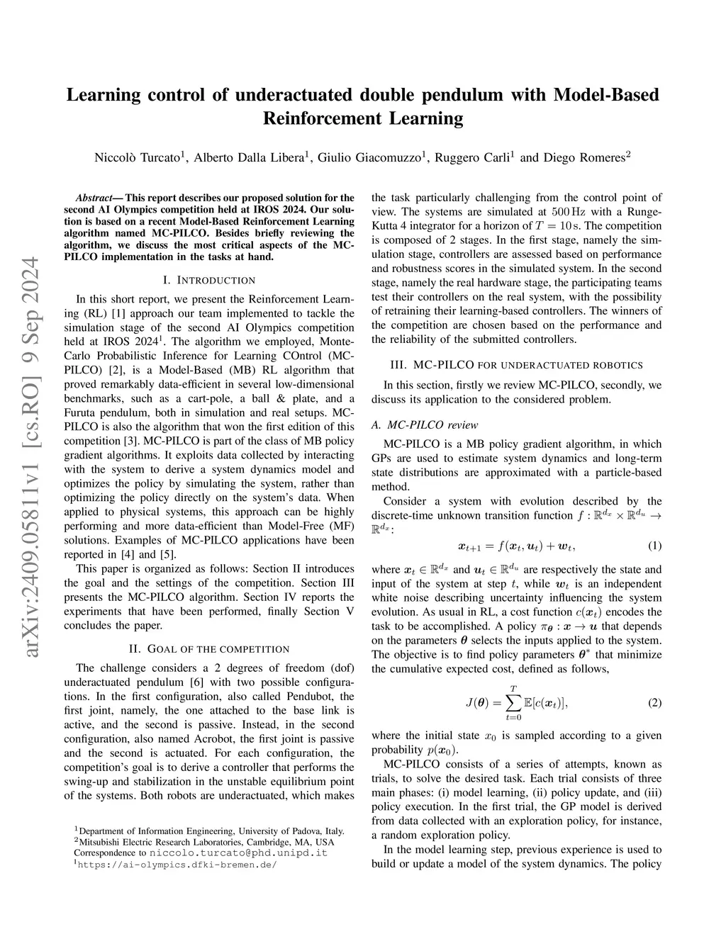 This report describes our proposed solution for the second AI Olympics competition held at IROS 2024. Our solution is based on a recent Model-Based Reinforcement Learning algorithm named MC-PILCO. Besides briefly reviewing the algorithm, we discuss the most critical aspects of the MC-PILCO implementation in the tasks at hand.