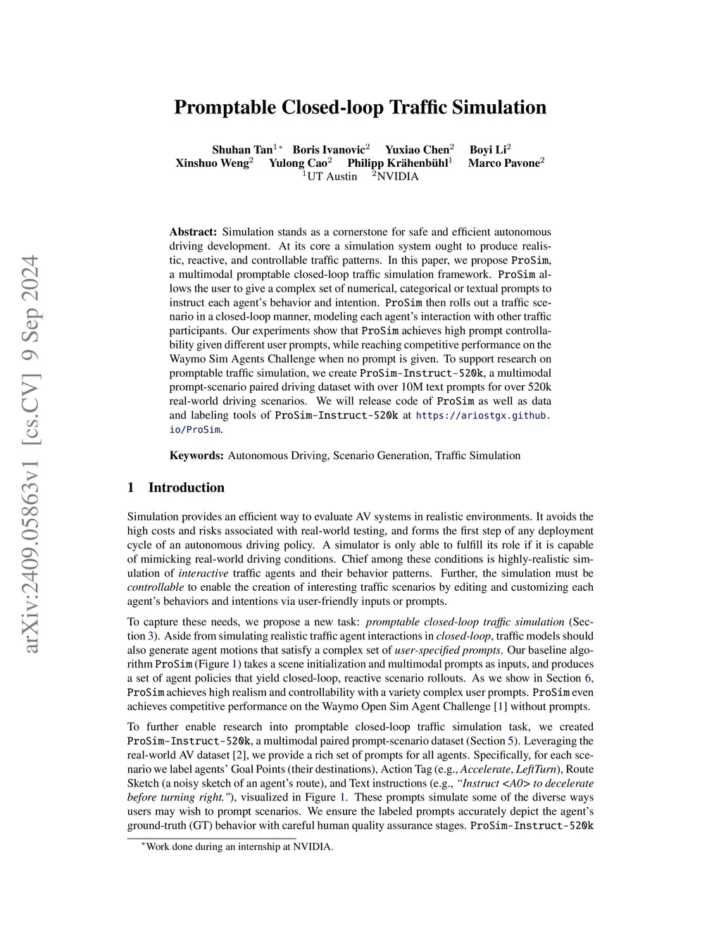 Simulation stands as a cornerstone for safe and efficient autonomous driving development. At its core a simulation system ought to produce realistic, reactive, and controllable traffic patterns. In this paper, we propose ProSim, a multimodal promptable closed-loop traffic simulation framework. ProSim allows the user to give a complex set of numerical, categorical or textual prompts to instruct each agent's behavior and intention. ProSim then rolls out a traffic scenario in a closed-loop manner, modeling each agent's interaction with other traffic participants. Our experiments show that ProSim achieves high prompt controllability given different user prompts, while reaching competitive performance on the Waymo Sim Agents Challenge when no prompt is given. To support research on promptable traffic simulation, we create ProSim-Instruct-520k, a multimodal prompt-scenario paired driving dataset with over 10M text prompts for over 520k real-world driving scenarios. We will release code of ProSim as well as data and labeling tools of ProSim-Instruct-520k at https://ariostgx.github.io/ProSim.