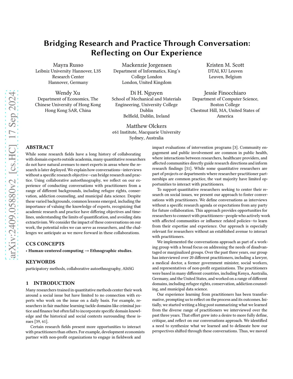 While some research fields have a long history of collaborating with domain experts outside academia, many quantitative researchers do not have natural avenues to meet experts in areas where the research is later deployed. We explain how conversations -- interviews without a specific research objective -- can bridge research and practice. Using collaborative autoethnography, we reflect on our experience of conducting conversations with practitioners from a range of different backgrounds, including refugee rights, conservation, addiction counseling, and municipal data science. Despite these varied backgrounds, common lessons emerged, including the importance of valuing the knowledge of experts, recognizing that academic research and practice have differing objectives and timelines, understanding the limits of quantification, and avoiding data extractivism. We consider the impact of these conversations on our work, the potential roles we can serve as researchers, and the challenges we anticipate as we move forward in these collaborations.