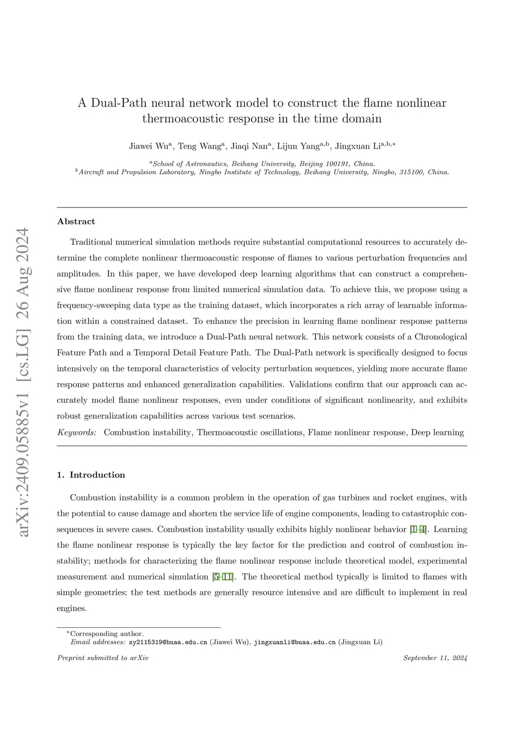 Traditional numerical simulation methods require substantial computational resources to accurately determine the complete nonlinear thermoacoustic response of flames to various perturbation frequencies and amplitudes. In this paper, we have developed deep learning algorithms that can construct a comprehensive flame nonlinear response from limited numerical simulation data. To achieve this, we propose using a frequency-sweeping data type as the training dataset, which incorporates a rich array of learnable information within a constrained dataset. To enhance the precision in learning flame nonlinear response patterns from the training data, we introduce a Dual-Path neural network. This network consists of a Chronological Feature Path and a Temporal Detail Feature Path. The Dual-Path network is specifically designed to focus intensively on the temporal characteristics of velocity perturbation sequences, yielding more accurate flame response patterns and enhanced generalization capabilities. Validations confirm that our approach can accurately model flame nonlinear responses, even under conditions of significant nonlinearity, and exhibits robust generalization capabilities across various test scenarios.
