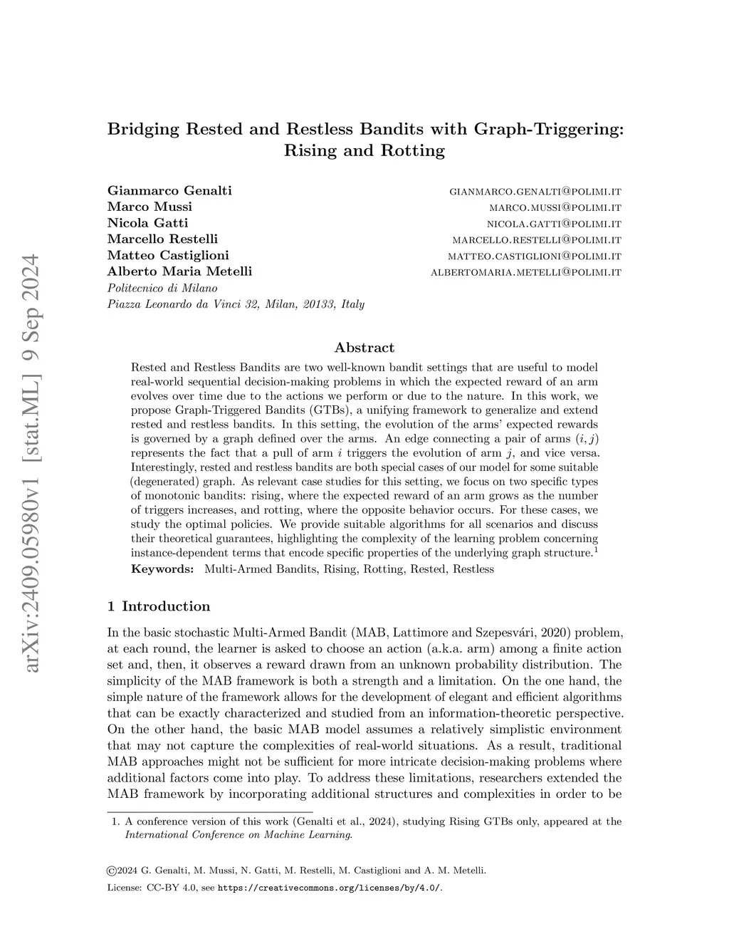 Rested and Restless Bandits are two well-known bandit settings that are useful to model real-world sequential decision-making problems in which the expected reward of an arm evolves over time due to the actions we perform or due to the nature. In this work, we propose Graph-Triggered Bandits (GTBs), a unifying framework to generalize and extend rested and restless bandits. In this setting, the evolution of the arms' expected rewards is governed by a graph defined over the arms. An edge connecting a pair of arms represents the fact that a pull of arm triggers the evolution of arm , and vice versa. Interestingly, rested and restless bandits are both special cases of our model for some suitable (degenerated) graph. As relevant case studies for this setting, we focus on two specific types of monotonic bandits: rising, where the expected reward of an arm grows as the number of triggers increases, and rotting, where the opposite behavior occurs. For these cases, we study the optimal policies. We provide suitable algorithms for all scenarios and discuss their theoretical guarantees, highlighting the complexity of the learning problem concerning instance-dependent terms that encode specific properties of the underlying graph structure.